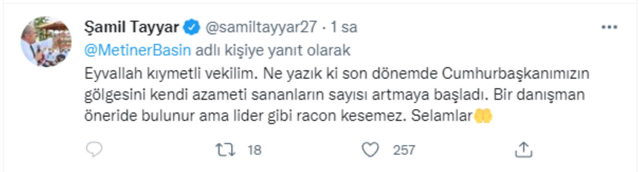 Tayyar da Metiner'in paylaşımına yanıt vererek "Eyvallah kıymetli vekilim. Ne yazık ki son dönemde Cumhurbaşkanımızın gölgesini kendi azameti sananların sayısı artmaya başladı. Bir danışman öneride bulunur ama lider gibi racon kesemez. Selamlar" yorumunda bulundu.