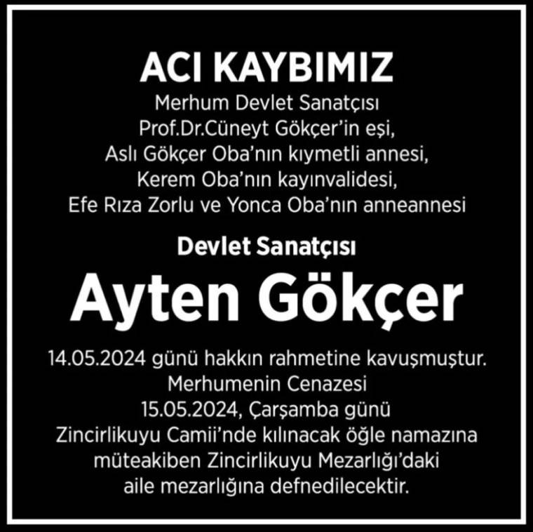 Cenaze bilgileri açıklanan usta sanatçı yarın öğlen Zincirlikuyu Mezarlığı’nda kılınacak cenaze namazının ardından Zincirlikuyu Mezarlığı’ndaki aile kabristanında defnedilecek.