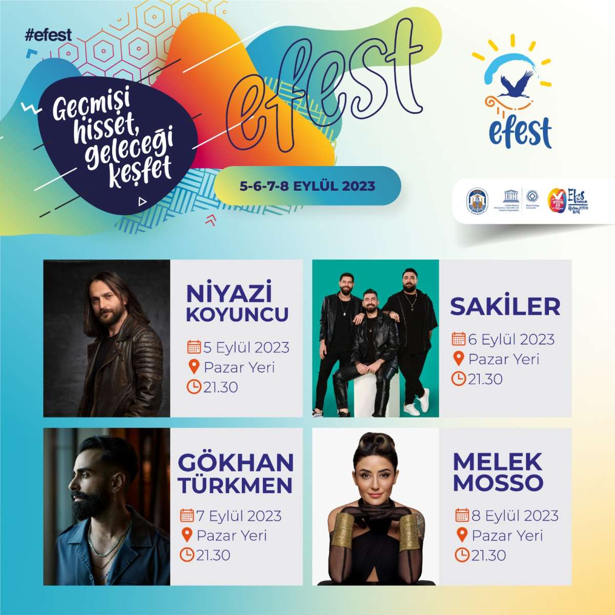 İzmir’de Efes Selçuk Belediyesi tarafından kültür sanat ve yaşam festivali EFEST 5-6-7-8 Eylül tarihlerinde kapılarını açacak. “Geçmişi Hisset, Geleceği Keşfet” sloganıyla düzenlenen EFEST, bu yıl da müzik dünyasının önemli isimlerini Efes Selçuk ile buluşturacak. Festival kapsamında 5 Eylül’de Niyazi Koyuncu, 6 Eylül’de Sakiler, 7 Eylül’de Gökhan Türkmen, 8 Eylül’de Melek Mosso sahne alacak. Sanatçıların konserleri festival süresince saat 21.30’da Pazar Yeri Ana Sahne’de gerçekleşecek.