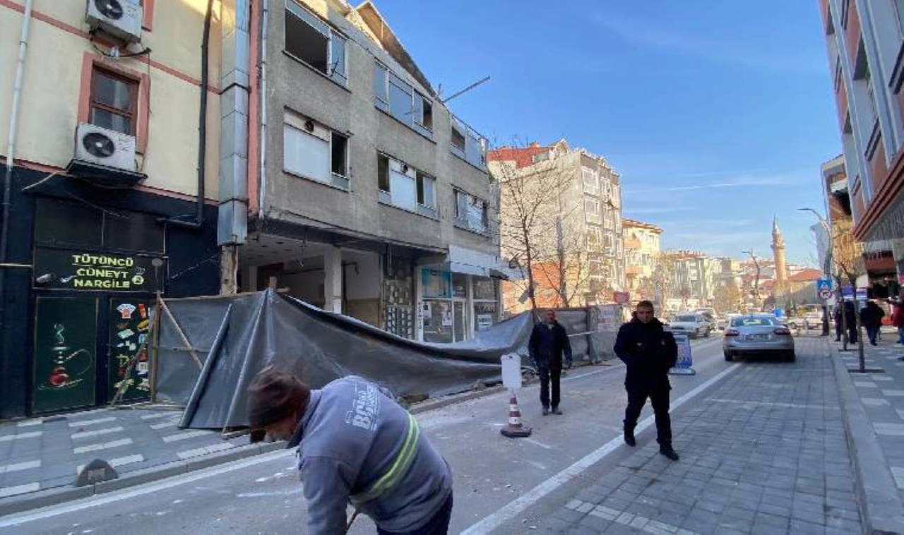 Riskli kategorisine giren binanın yıkım işlemleri sabah saatlerinde başladı. Sadece binanın önündeki kaldırımda güvenlik önlemi alınan yıkım çalışmaları sırasında kepçe darbesiyle binanın en üst katının bir kısmı PTT Caddesi üzerindeki araçların geçtiği yola devrildi.