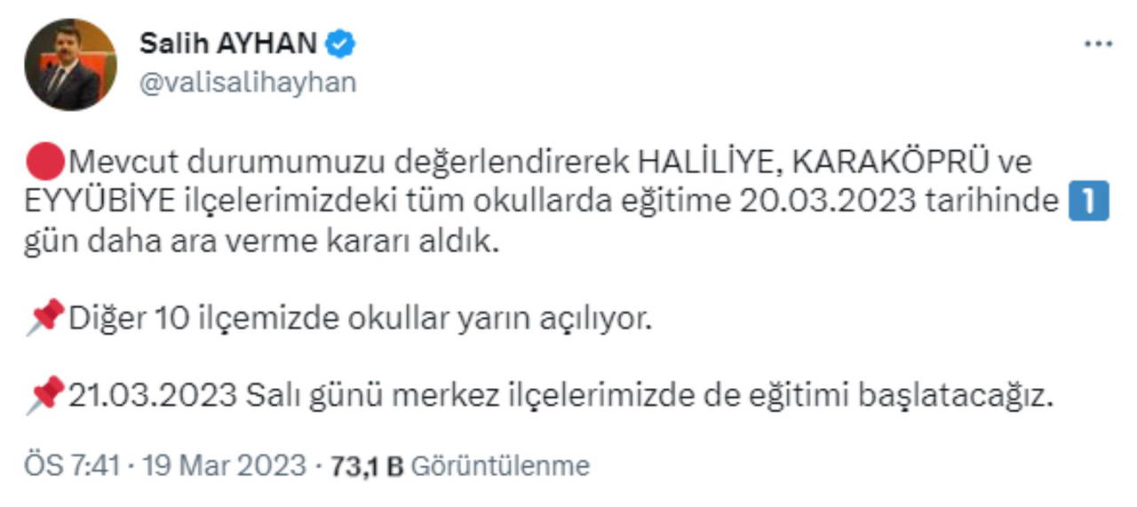 Şanlıurfa Valiliği, muhtemel yağışlar nedeniyle okulların 1 gün tatil edildiğini duyurdu. Vali Salih Ayhan, sosyal medya hesabından yaptığı paylaşımda, "Mevcut durumumuzu değerlendirerek Haliliye, Karaköprü ve Eyyübiye ilçelerimizdeki tüm okullarda eğitime 20 Mart tarihinde 1 gün daha ara verme kararı aldık. Diğer 10 ilçemizde okullar yarın açılıyor" dedi.