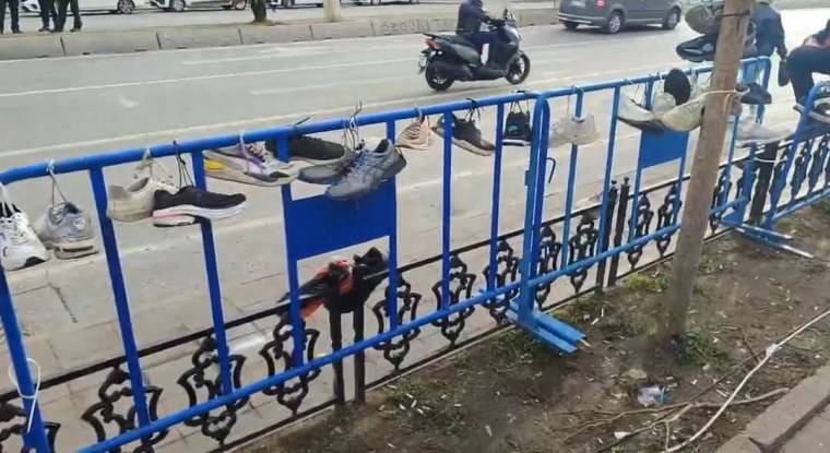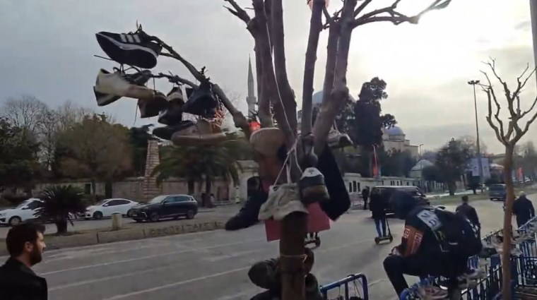Müdahalenin ardından ayakkabılardan bazıları Saraçhane'deki yol kenarına asılmış halde görüntülendi.