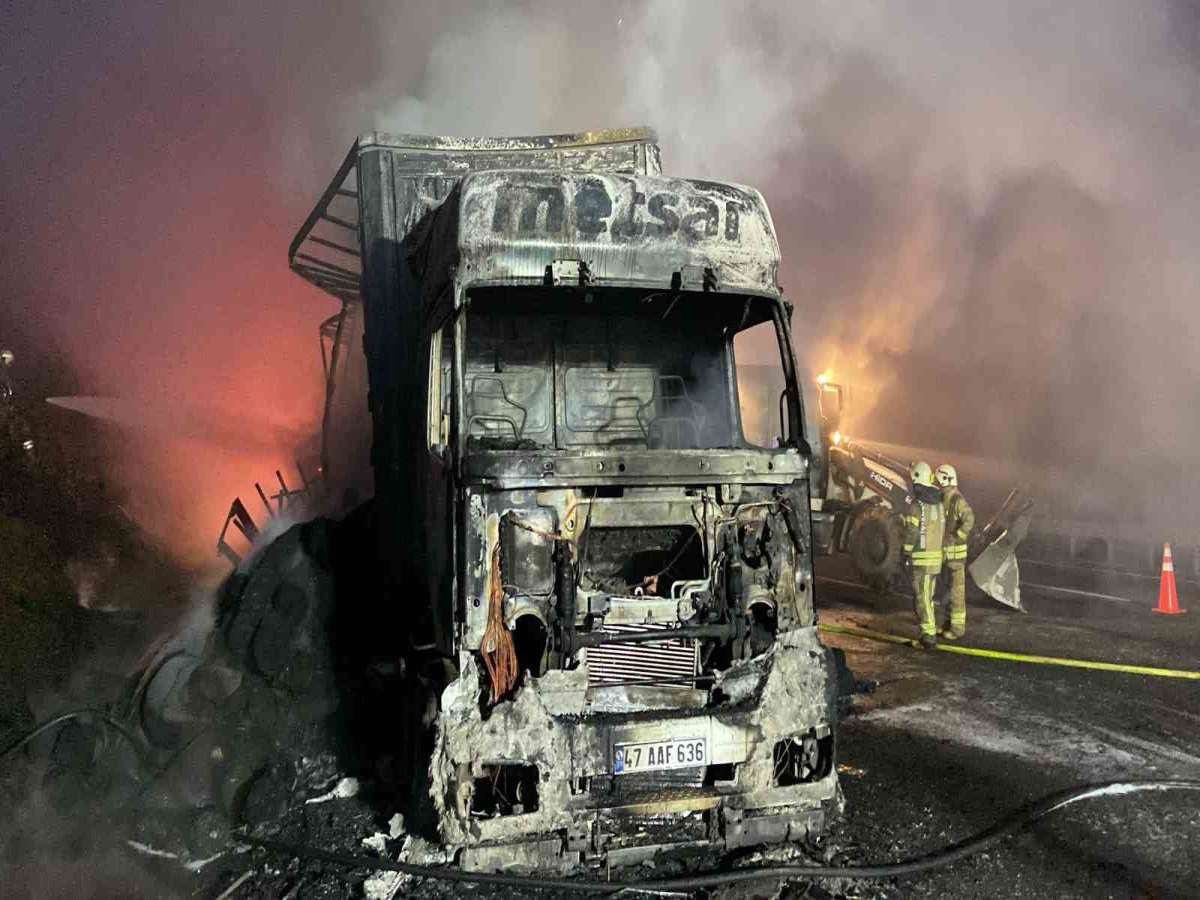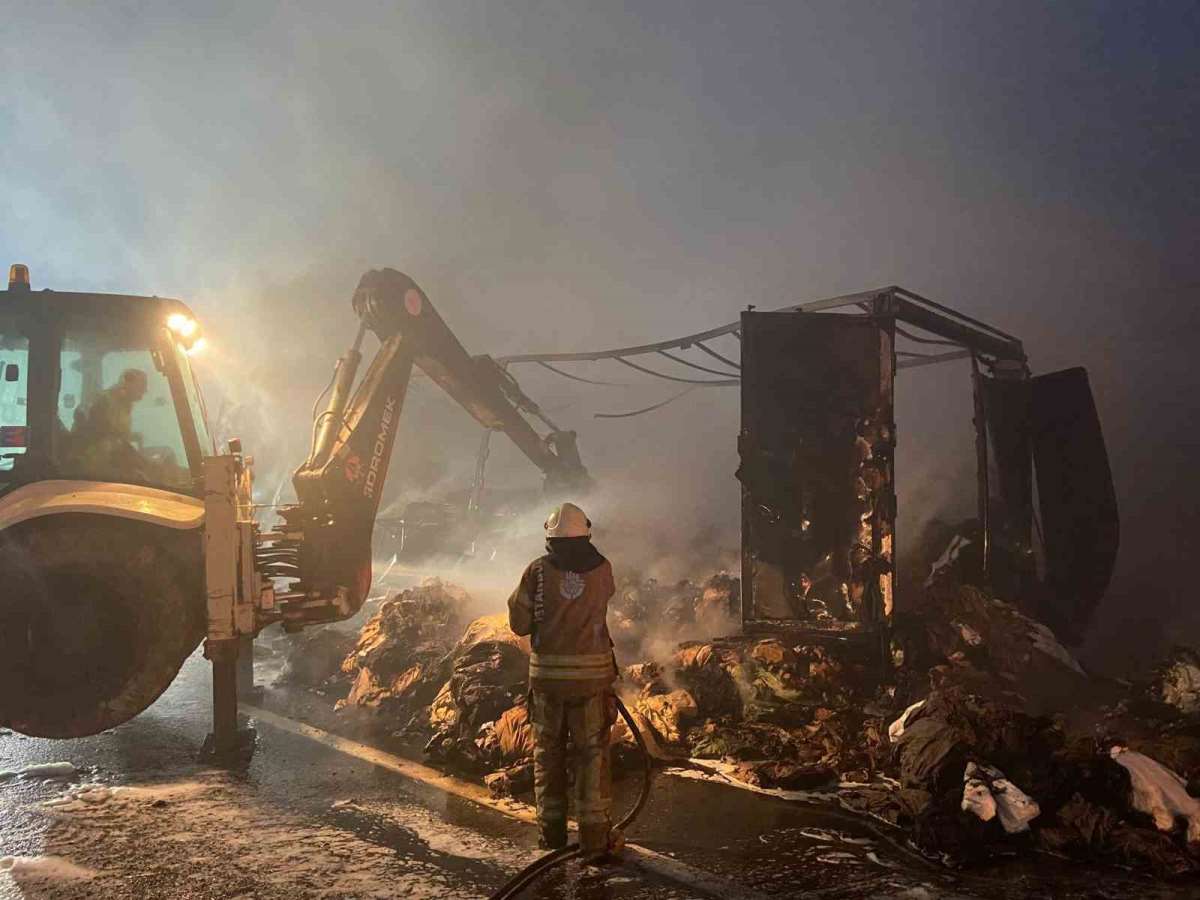 Yangında tır şoförü yara almadan kurtulurken TIR ve içindeki kumaşlar kullanılamaz hale geldi.
