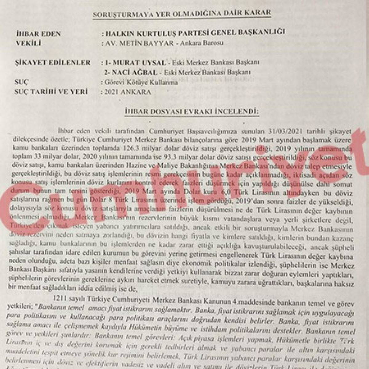 HKP’nin suç duyurusunu işleme alan Ankara Cumhuriyet Başsavcılığı, yaptığı inceleme sonucunda eski Merkez Bankası Başkanları Murat Uysal ve Naci Ağbal hakkında “Soruşturma yapılmasına yer olmadığına” dair karar verdi. Başsavcılık, Murat Uysal ve Naci Ağbal hakkında soruşturma ve kovuşturma yapılması için, “Cumhurbaşkanı’nın Cumhuriyet Başsavcılığı'na yazılı başvuruda bulunması şartına bağlı” olduğunu iddia etti.