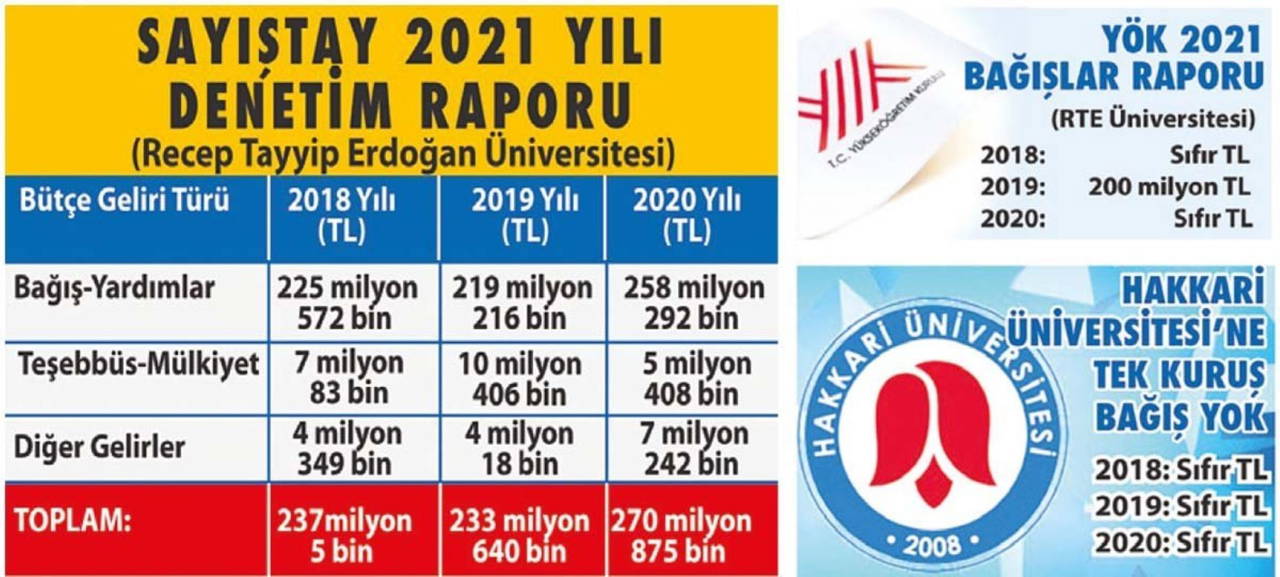Sayıştay Denetim Raporu (2021): RTE Üniversitesi'ne hayırseverler 2018'de 225 milyon 572 bin, 2019'da 219 milyon 216 bin ve 2020'de 258 milyon 292 bin bin olmak üzere 3 yılda 703 milyon 80 bin lira bağış yapılmış. Sayıştay'ın 2021 Eylül'deki son raporunda bağışlar kalem kalem yazıyor.