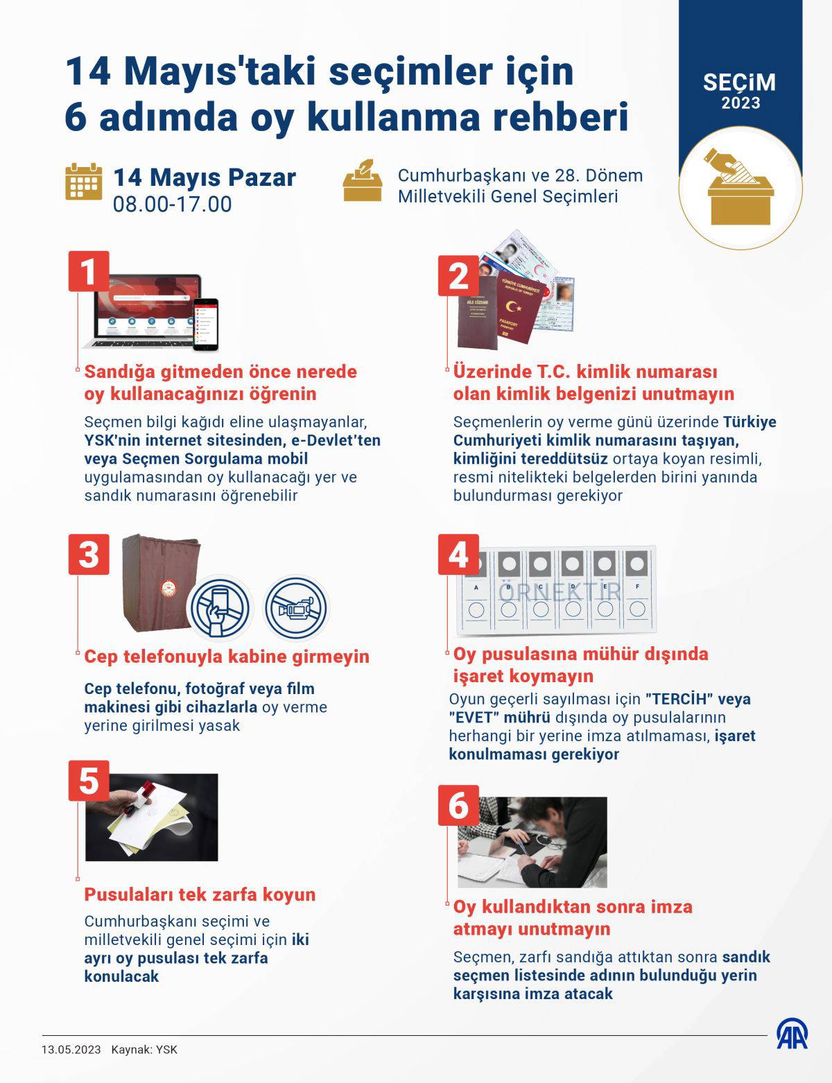 Seçmenler, 14 Mayıs 2023 Pazar günü (yarın) gerçekleştirilecek Cumhurbaşkanı Seçimi ve 28. Dönem Milletvekili Genel Seçimi'nde oylarını 6 adımda kullanacak.