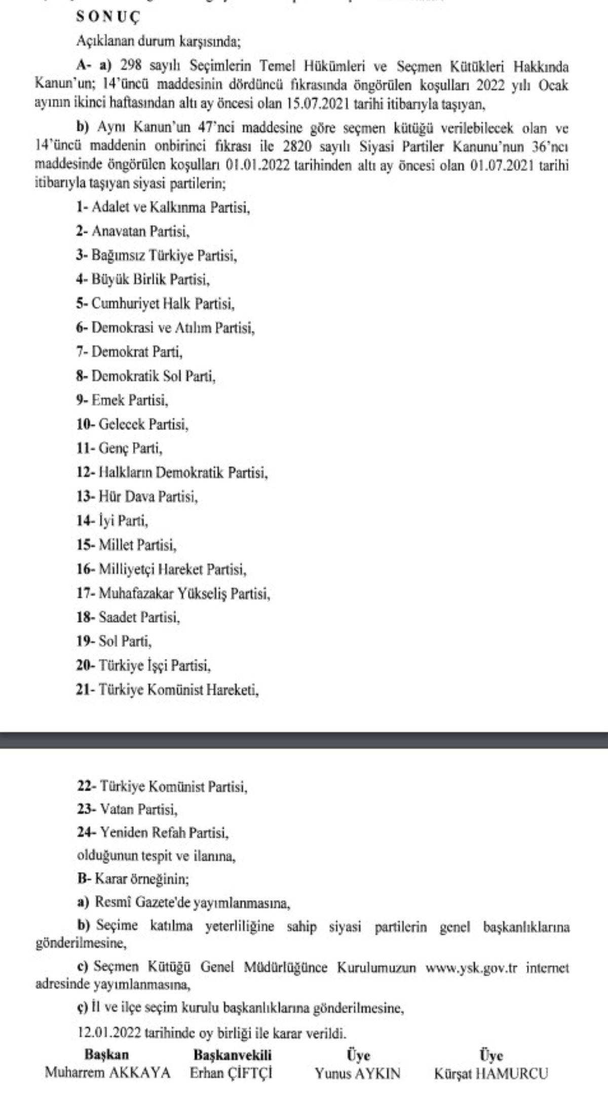 YSK'nin bugünkü mükerrer sayısında yayımlanan kararında, 298 sayılı "Seçimlerin Temel Hükümleri ve Seçmen Kütükleri Hakkında Kanun" ile 2820 sayılı "Siyasi Partiler Kanunu"nun ilgili maddelerine göre, 1 Ocak'tan en az 6 ay öncesi itibarıyla illerin en az yarısında teşkilat kurdukları ve büyük kongrelerini yaptıkları saptanan 24 siyasi partinin seçimlere katılma yeterliliği bulunduğu ifade edildi.