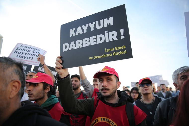 İzmir Emek ve Demokrasi Güçleri bileşenleri, Esenyurt, Mardin Büyükşehir, Batman ve Halfeti belediyelerine kayyum atamasını protesto etti.