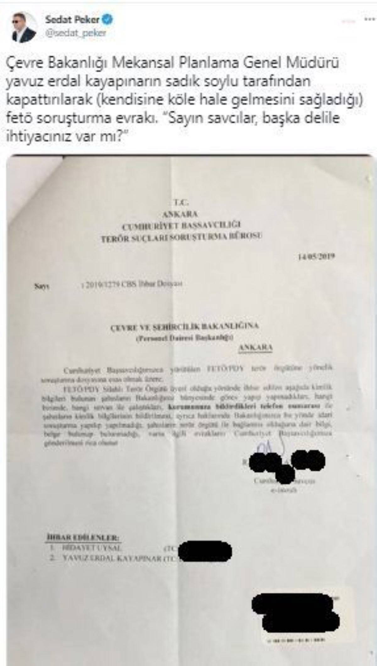 Organize suç örgütü yöneticiliği suçundan hakkında yakalama kararı çıkarılan Sedat Peker, 23 Mayıs 2021 tarihinde yaptığı sosyal medya paylaşımında, Çevre ve Şehircilik Bakanlığı Mekânsal Planlama Genel Müdürü Yavuz Erdal Kayapınar ve Yardımcısı Hidayet Uysal’ın hakkındaki “FETÖ soruşturmasının” kapattırıldığını iddia etmişti. Peker, soruşturmayı İçişleri Bakanı Süleyman Soylu’nun akrabası Sadık Soylu’nun kapattırdığını açıklamıştı.