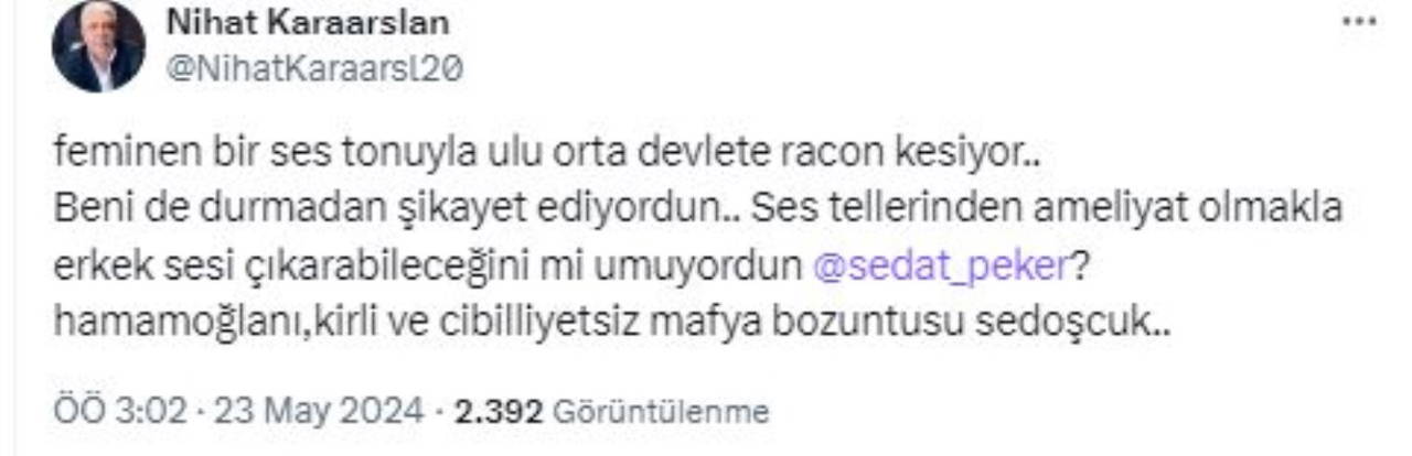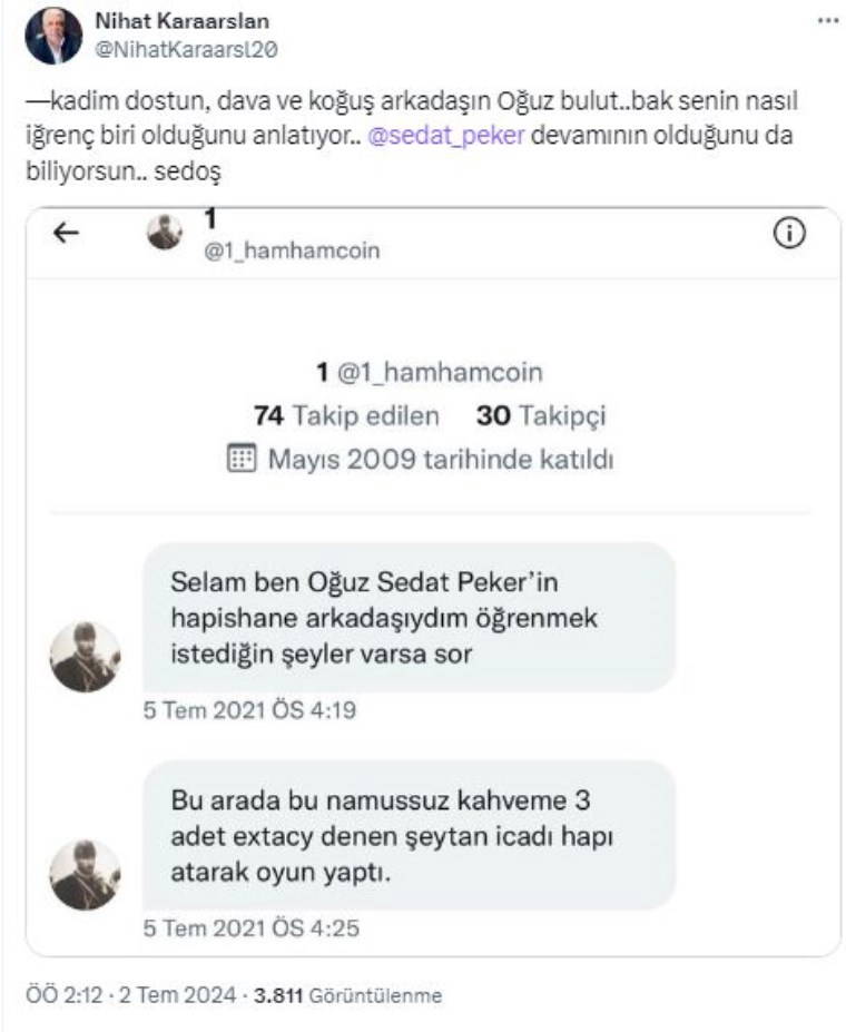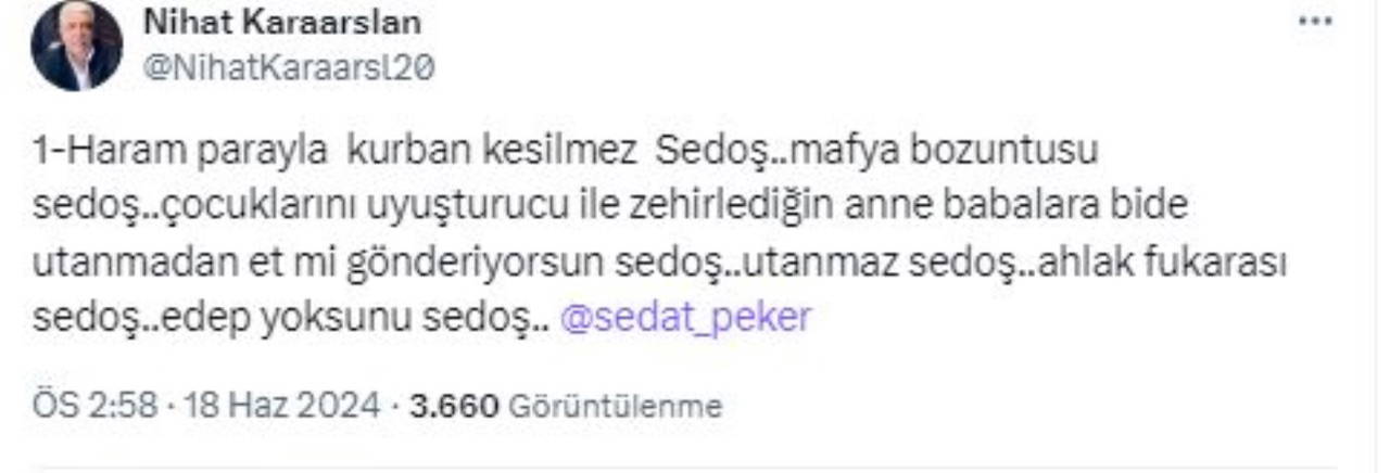 Nihat Karaarslan'ın sosyal medya hesabından son dönemlerde suç örgütü lideri Sedat Peker aleyhinde paylaşımlar yapmasıyla dikkat çekiyordu.