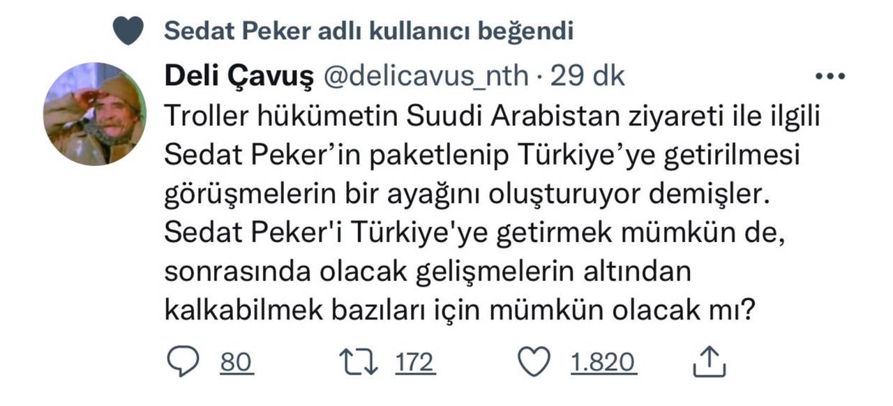 Sedat Peker’e yakın bir diğer Twitter hesabı olan ve bir süre ifşa paylaşımlarının yapıldığı “Deli Çavuş” isimli hesaptan da bir yeni paylaşım geldi. Söz konusu paylaşımda, "Troller hükümetin Suudi Arabistan ziyareti ile ilgili Sedat Peker’in paketlenip Türkiye’ye getirilmesi görüşmelerin bir ayağını oluşturuyor demişler. Sedat Peker'i Türkiye'ye getirmek mümkün de, sonrasında olacak gelişmelerin altından kalkabilmek bazıları için mümkün olacak mı?" ifadelerine yer verildi. Öte yandan, söz konusu paylaşımı Peker'in beğenmesi ise dikkat çekti.
