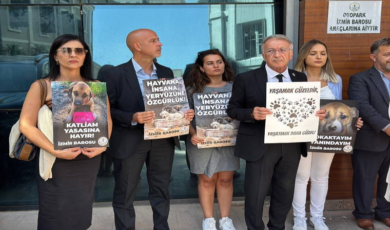 İzmir Barosu, 4 Ekim Dünya Hayvanları Koruma Günü kapsamında baro önünde bir basın açıklaması yaptım. İzmir Barosu Başkanı Sefa Yılmaz’ın da katıldığı açıklamada avukatlar, “Yaşamak güzeldir, yaşatmak daha güzeldir”, “Katliam yasasına hayır”, “Hayvana, insana, yeryüzüne özgürlük”, “Mezbahadan barınağa tüm türler özgürdür” yazan dövizler taşıdı.