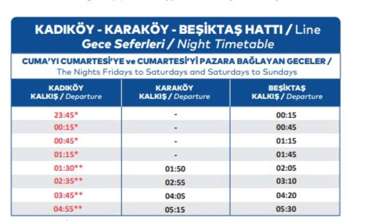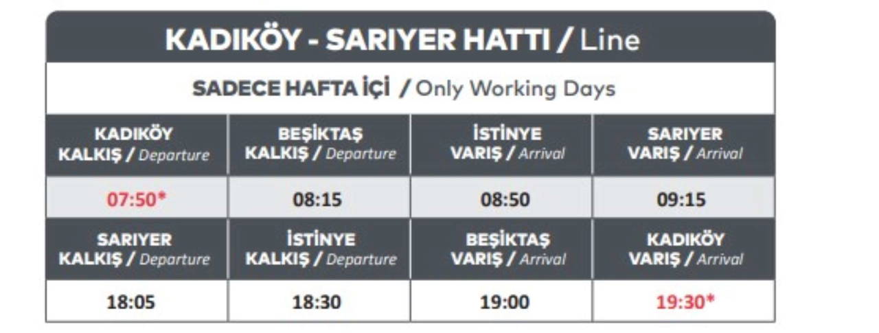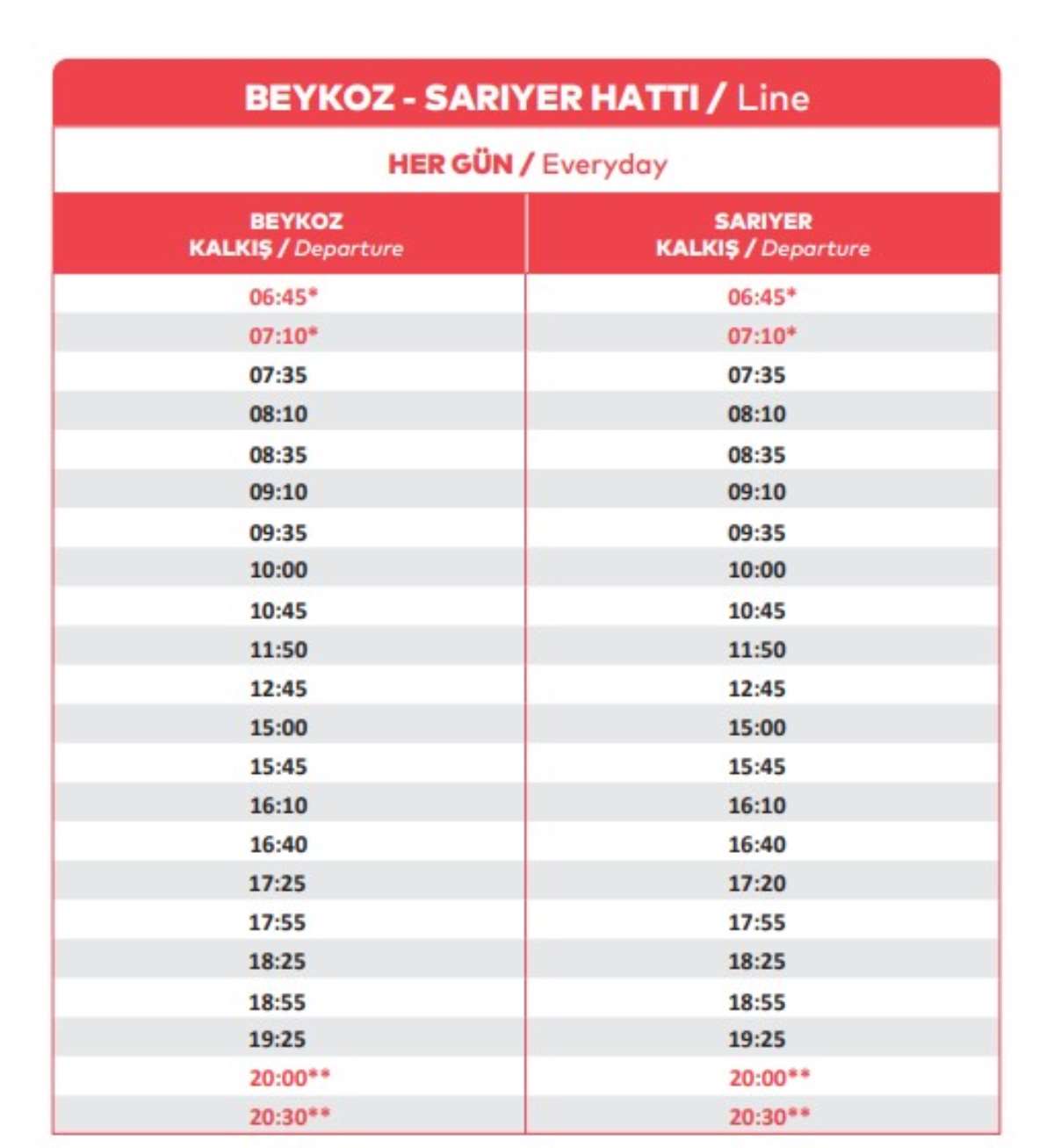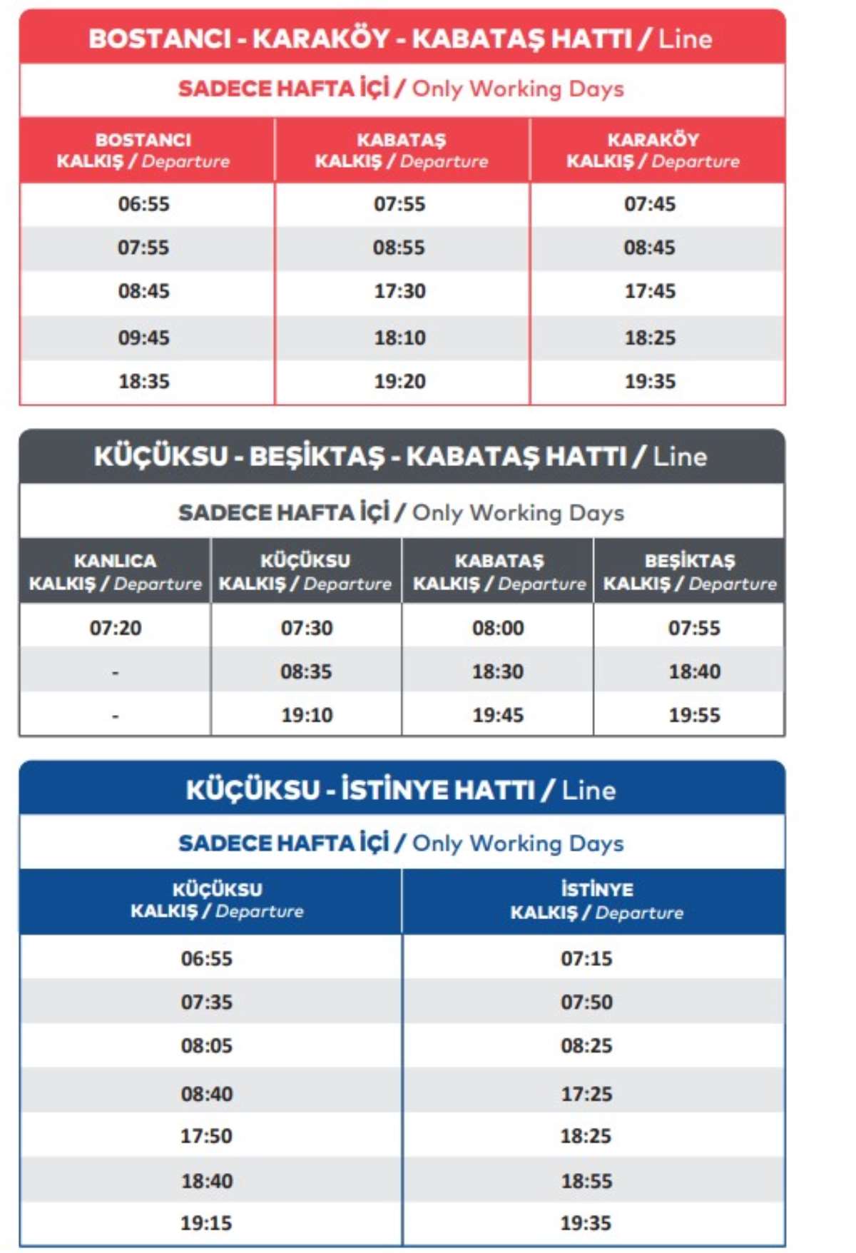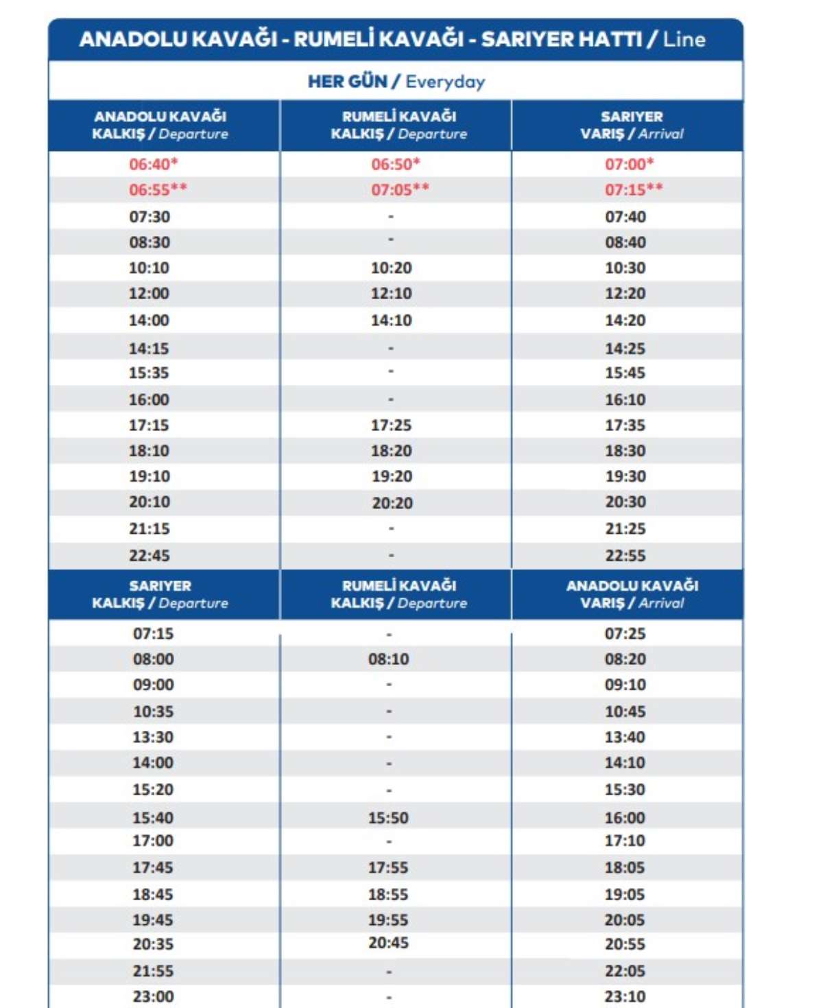 Geçtiğimiz yılın kış tarifesinden farklı olarak Sarıyer-Beykoz ve Rumeli Kavağı-Eminönü hatlarındaki sefer saatlerinde değişiklikler bulunuyor. Yaz tarifesinde de yer alan Küçüksu-Beşiktaş-Kabataş hattınaysa Kanlıca uğraması ekleniyor.