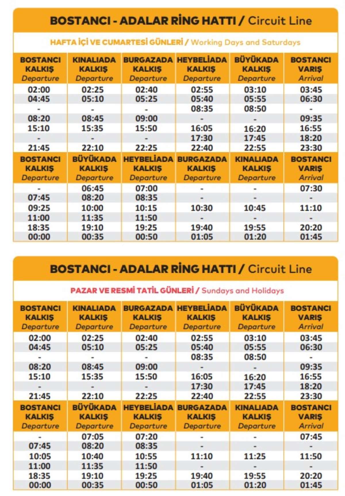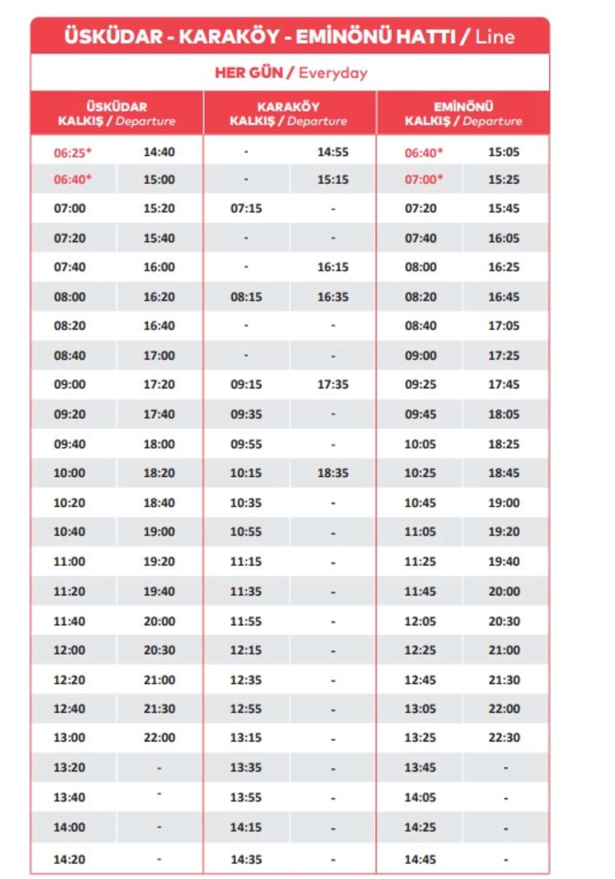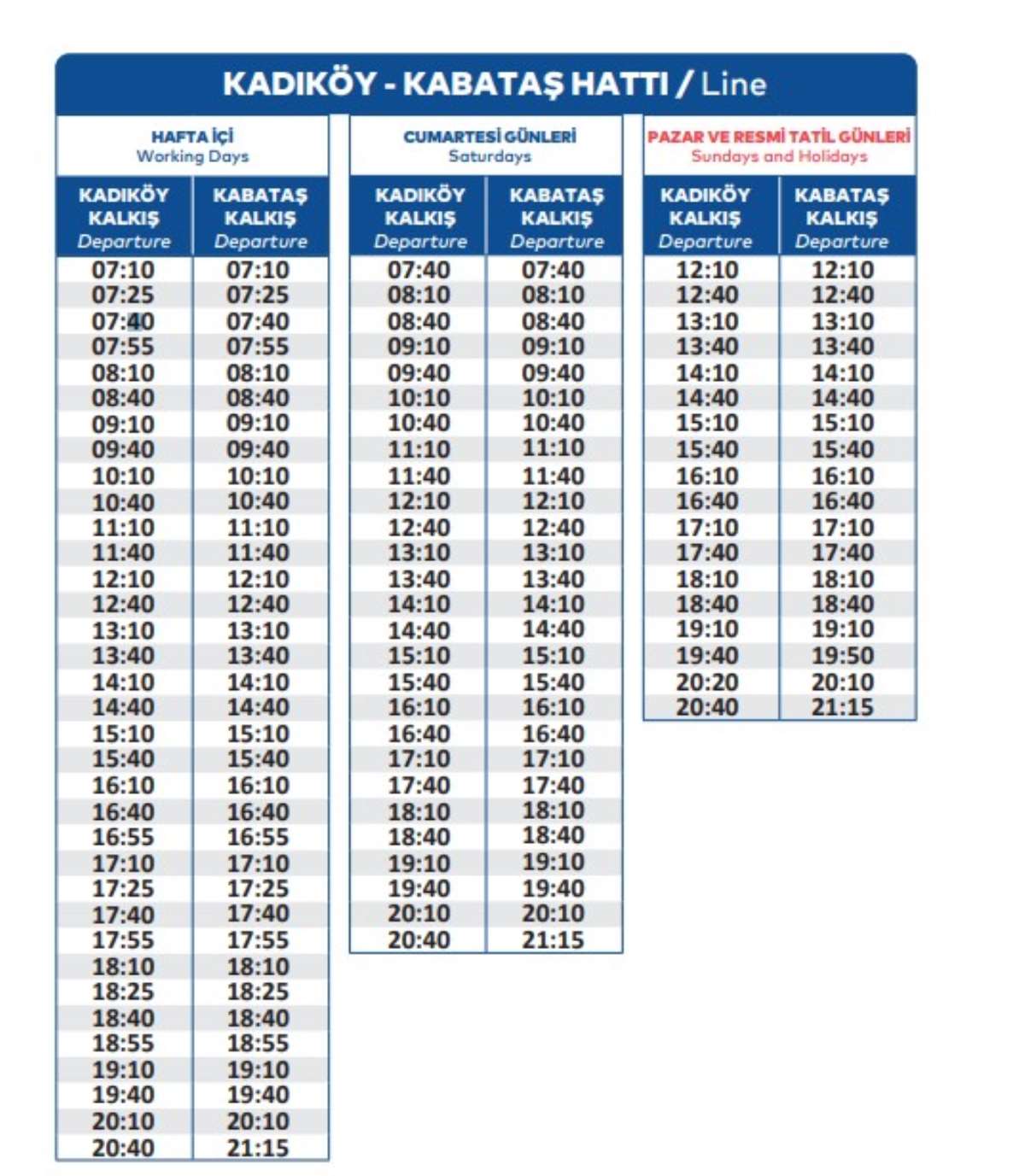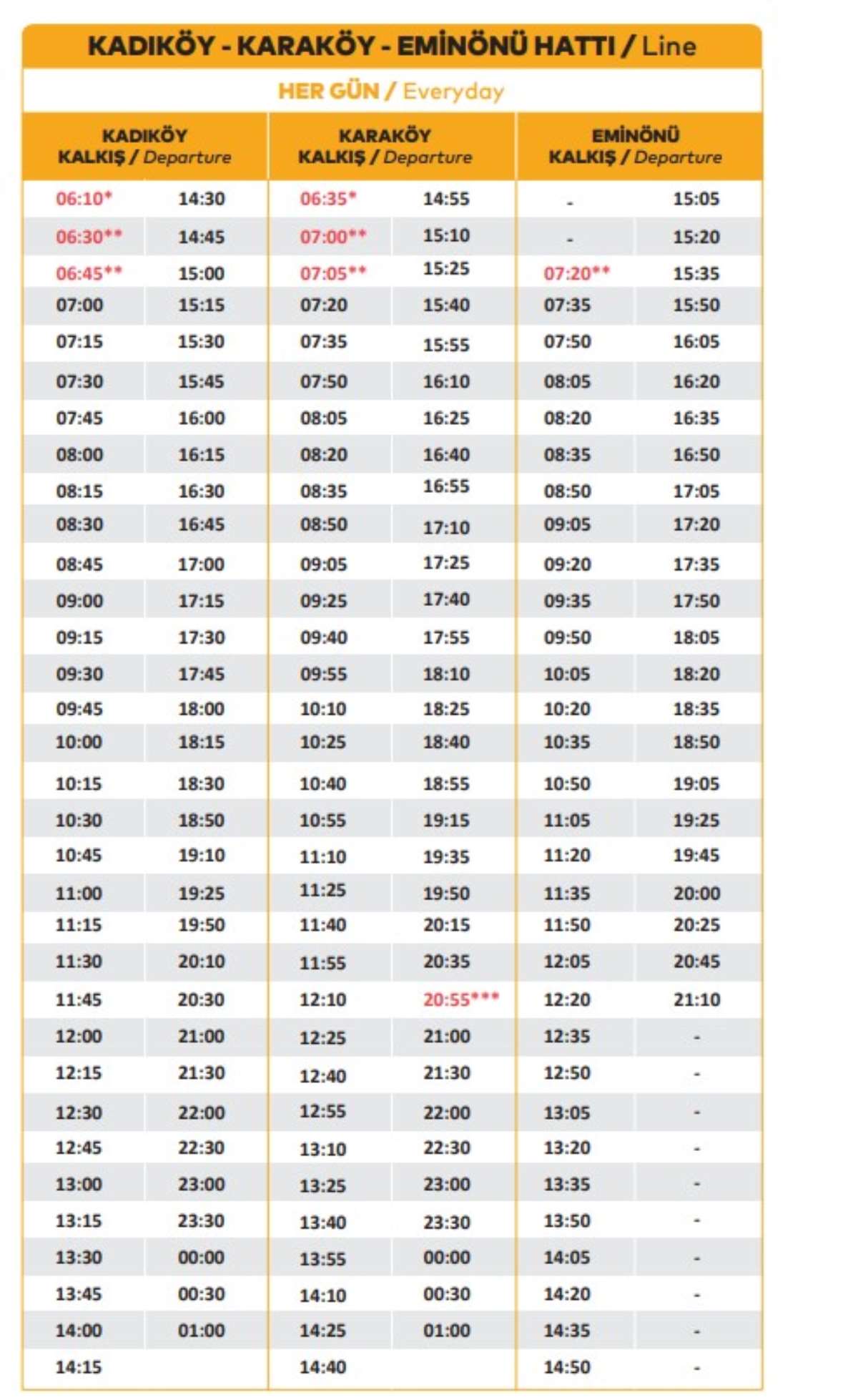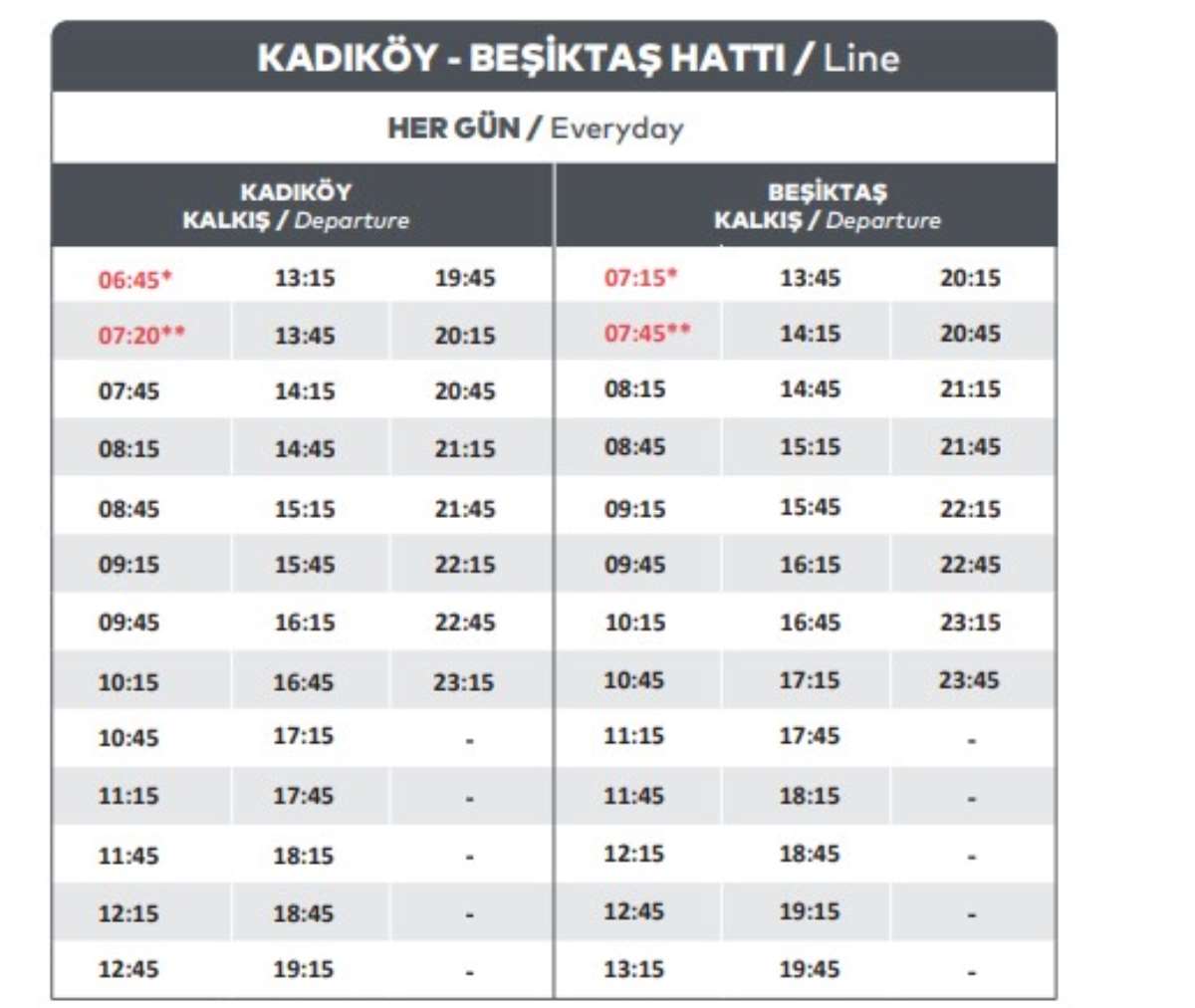 18 Eylül 2023 – 16 Haziran 2024 tarihleri arasında uygulanacak kış tarifesi kitapçığına Şehir Hatları iskelelerinden ulaşılabiliyor. Ayrıca Şehir Hatları internet sitesi, mobil uygulaması, sosyal medya hesapları üzerinden ve Alo 153 Beyaz Masa danışma hattından da sefer tarifesine ulaşmak mümkün.