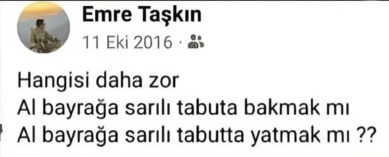 Malatyalı şehit Emre Taşkın'ın 11 Ekim 2016'da sosyal medya hesabından, 'Hangisi daha zor, al bayrağa sarılı tabuta bakmak mı, al bayrağa sarılı tabutta yatmak mı' paylaşımı yaptığı ortaya çıktı.