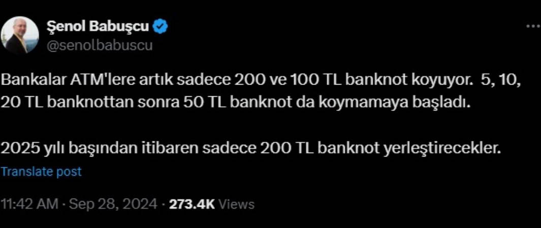 "Bankalar ATM'lere artık sadece 200 ve 100 TL banknot koyuyor. 5,10,20 TL banknottan sonra 50 TL banknot da koymamaya başladı. 2025 yılı başından itibaren sadece 200 TL banknot yerleştirecekler'' demişti.