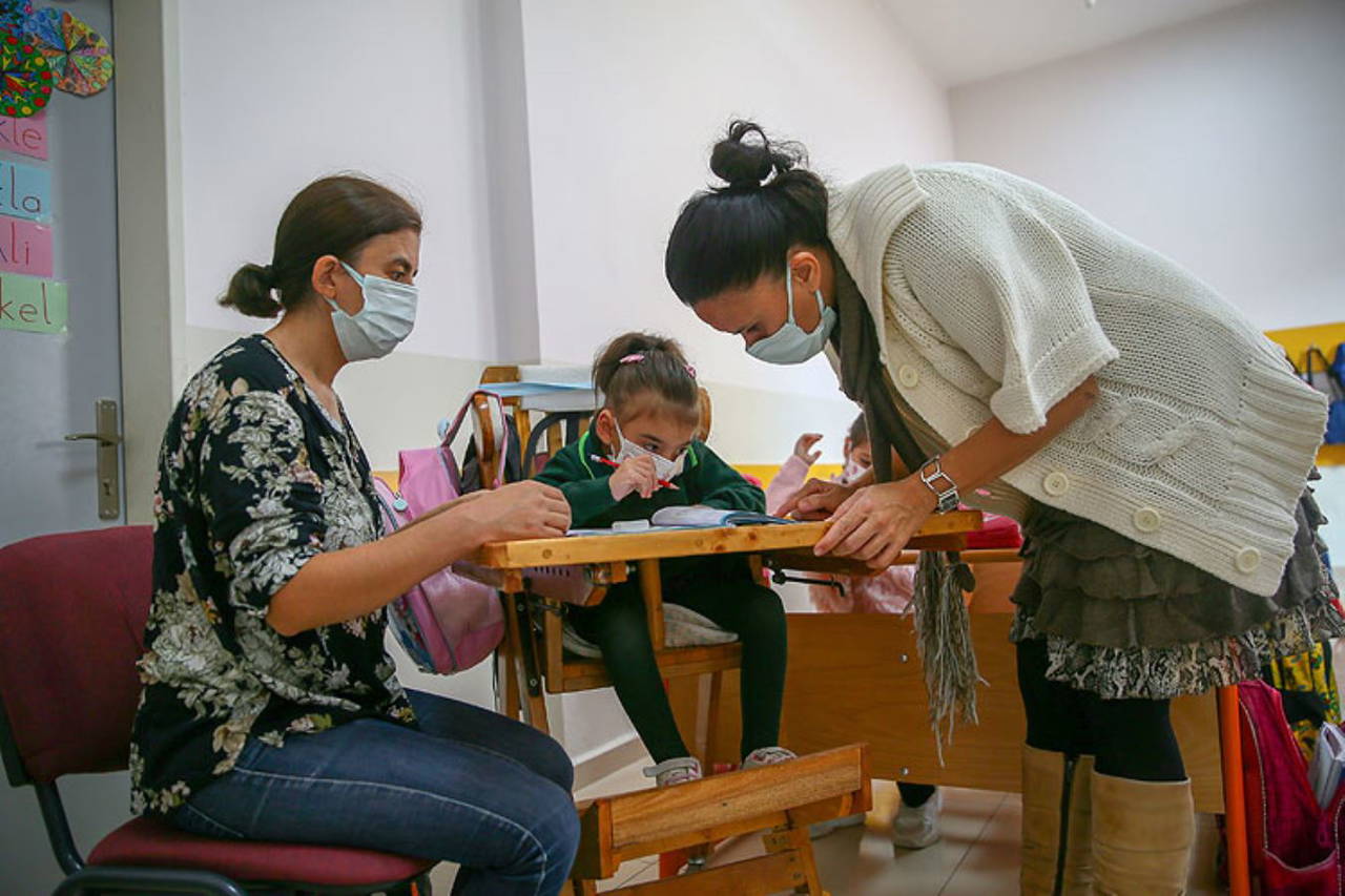 Ders sırasında sınıfta kızı için özel olarak yaptırdıkları masa ve sandalyede yardımcı olmaya çalışan Hülya Yüksel, teneffüslerde Ayşe'yi yine tekerlekli sandalyesine bindirerek dışarı çıkarıyor.