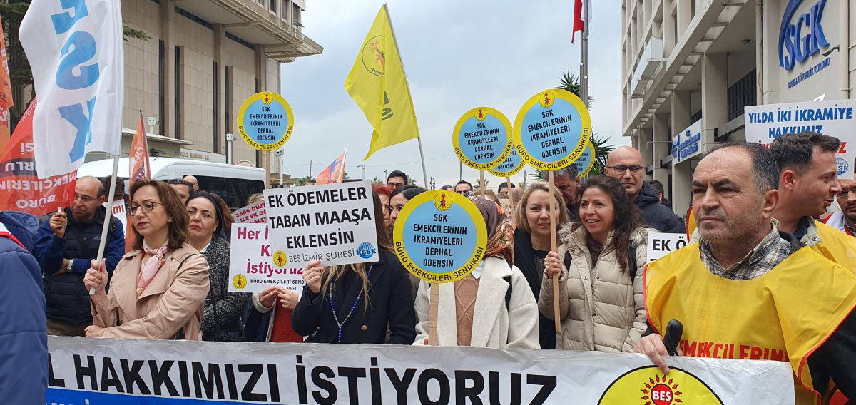 “İkramiye hakkımız söke söke alırız”, “Direne direne kazanacağız” sloganları ve alkışlarla kurumu protesto eden kamu emekçileri adına hazırlanan ortak açıklamayı okuyan Büro Emekçileri Sendikası (BES) İzmir Şubesi Başkanı Mustafa Güven daha önceden dile getirdikleri talepleri dikkate alınmadığı takdirde örgütlenerek yeniden greve çıkacaklarını duyurdu ve “SGK Emekçilerini yok sayanlara, taleplerimizi görmezden gelenlere, fazla mesai ücretini 51 liraya çıkardık diyenlere karşı, bizi EYT yoğunluğu altında unutanlara karşı sesimizi duyurmak için iş bırakıyoruz. EYT başvuruları ve diğer yüklerle birlikte SGK çalışanı esnek, kuralsız, sağlığını bozacak şekilde fazla ve mobbing altında çalıştırılmaktadır. Yılda 270 saat olan yasal fazla mesai sınırı ayda 100 saati aşılmaktadır. Çalışanların fazla mesai, angarya çalışma dayatmasıyla günlük ortalama çalışma süresi 11 saati geçmiştir. SGK emekçilerini bu ağır iş yükü ile baş başa bırakanlar, geçmişten bugüne yaşadıkları ekonomik kayıtlarını görmezden gelmeye devam etmektedirler" dedi.