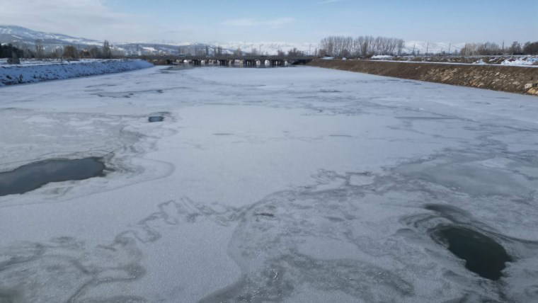 Tarihi Eğri Köprü civarındaki bölümünde nehrin yüzeyi tamamen donarken, Kesik Köprü civarında ise akışın olduğu ancak buz kütlelerinin oluştuğu görüldü. Buz tutan nehir dronla görüntülendi.