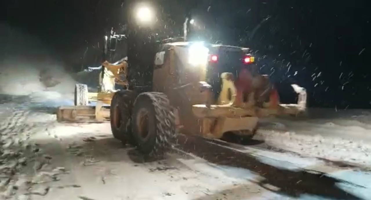 Karla mücadele ekipleri, yoğun kar yağışı nedeniyle bölgede iş makinalarıyla yol açma çalışmalarını sürdürüyor.
