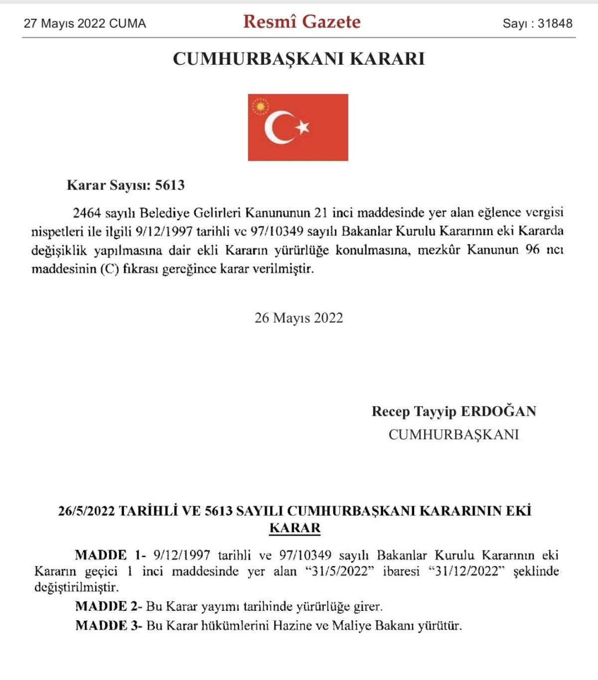 Bu kararla, bu tarihe kadar sinema biletlerinden eğlence vergisi alınıyordu. Bugün yayımlanan Resmi Gazete ile birlikte "Eğlence Vergisi"nde uygulanacak vergi istisnası 2022 yılı sonuna kadar uzatıldı.