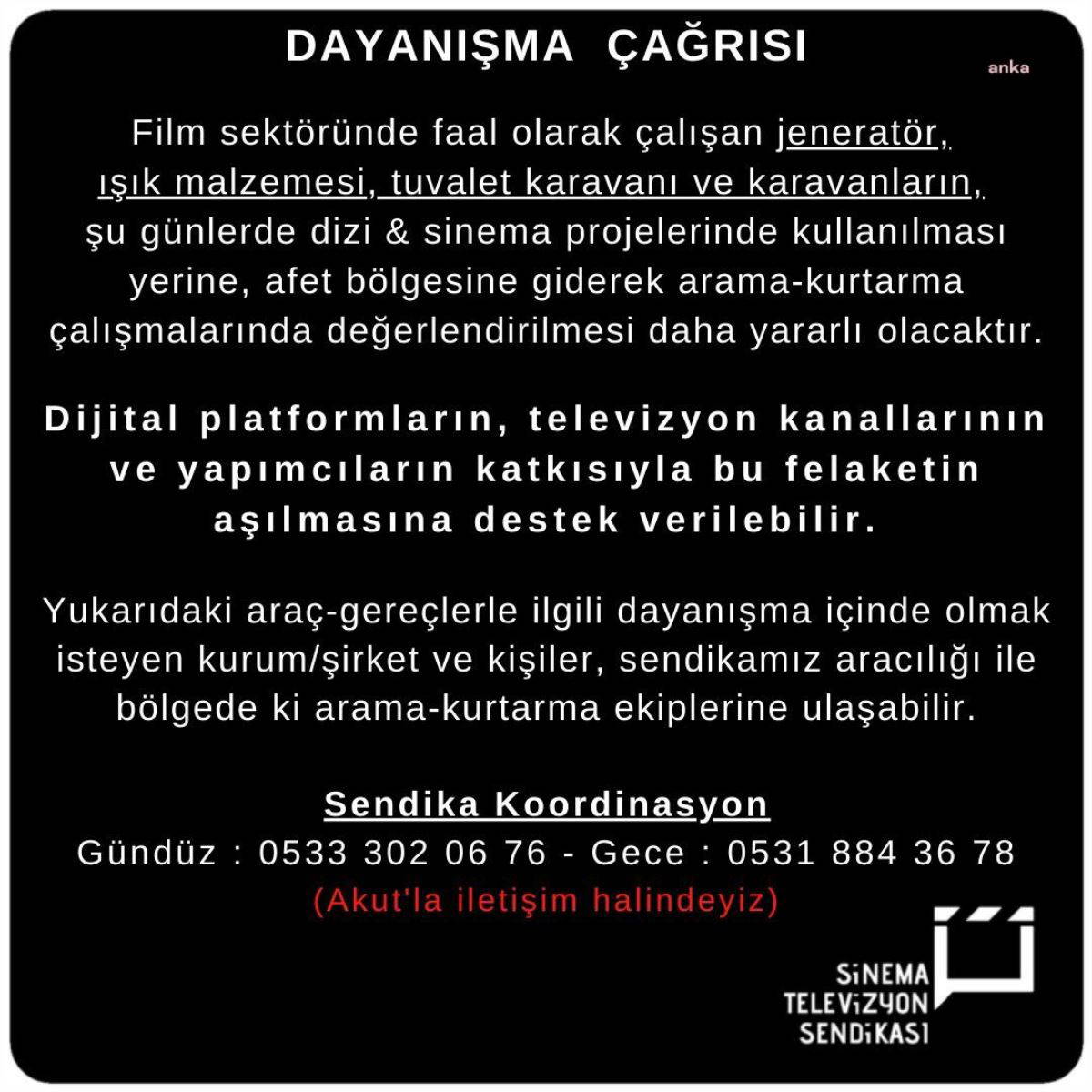 “Dayanışma çağrısı. Film sektöründe faal olarak çalışan jeneratör, ışık malzemesi, tuvalet karavanı ve karavanların şu günlerde dizi ve sinema projelerinde kullanılması yerine, afet bölgesine giderek arama – kurtarma çalışmalarında değerlendirilmesi daha yararlı olacaktır.