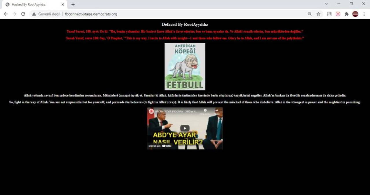 Daha önce Amerika'nın "İslam ve Türkiye düşmanlığı" ile Fethullah Gülen’i teslim etmemesine tepki koymak için ‘hacktivist’ eylemler yaptığını açıklayan Can Cebeci ele geçirdiği fbconnect-stage.democrats.org adlı adrese de bir not bıraktı. Adresin daha önce Demokrat Parti’nin internet adresine giriş ve kayıt işlemlerinde kullanıldığı öğrenildi.