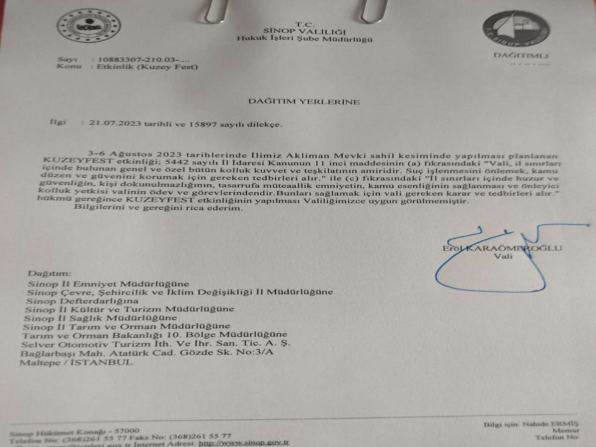 Sinop’ta 3- 6 ağustos tarihleri arasında yapılması planlanan ve onbinlerce bilet satışının yapıldığı Kuzey Fest adlı festivale Sinop Valisi Erol Karaömeroğlu’ndan izin çıkmadı. 2020- 2021 ve 2022 yıllarında aynı Vali tarafından izin verilen festivalin yasaklanması dikkat çekti.