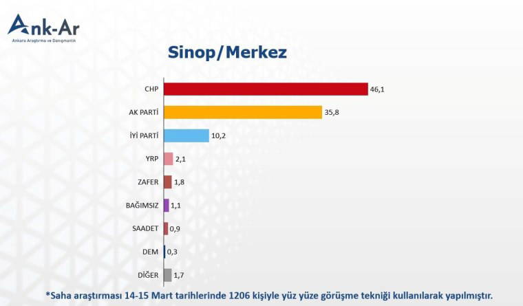Ankara Araştırma ve Danışmanlık (Ank-Ar) Şirketi'nin Sinop’un merkezinde 1206 kişiyle yüz yüze görüşme tekniğiyle yaptığı anket araştırmasına göre; CHP’nin Sinop Belediye Başkan adayı Metin Gürbüz açık ara farkla seçimi kazanıyor.