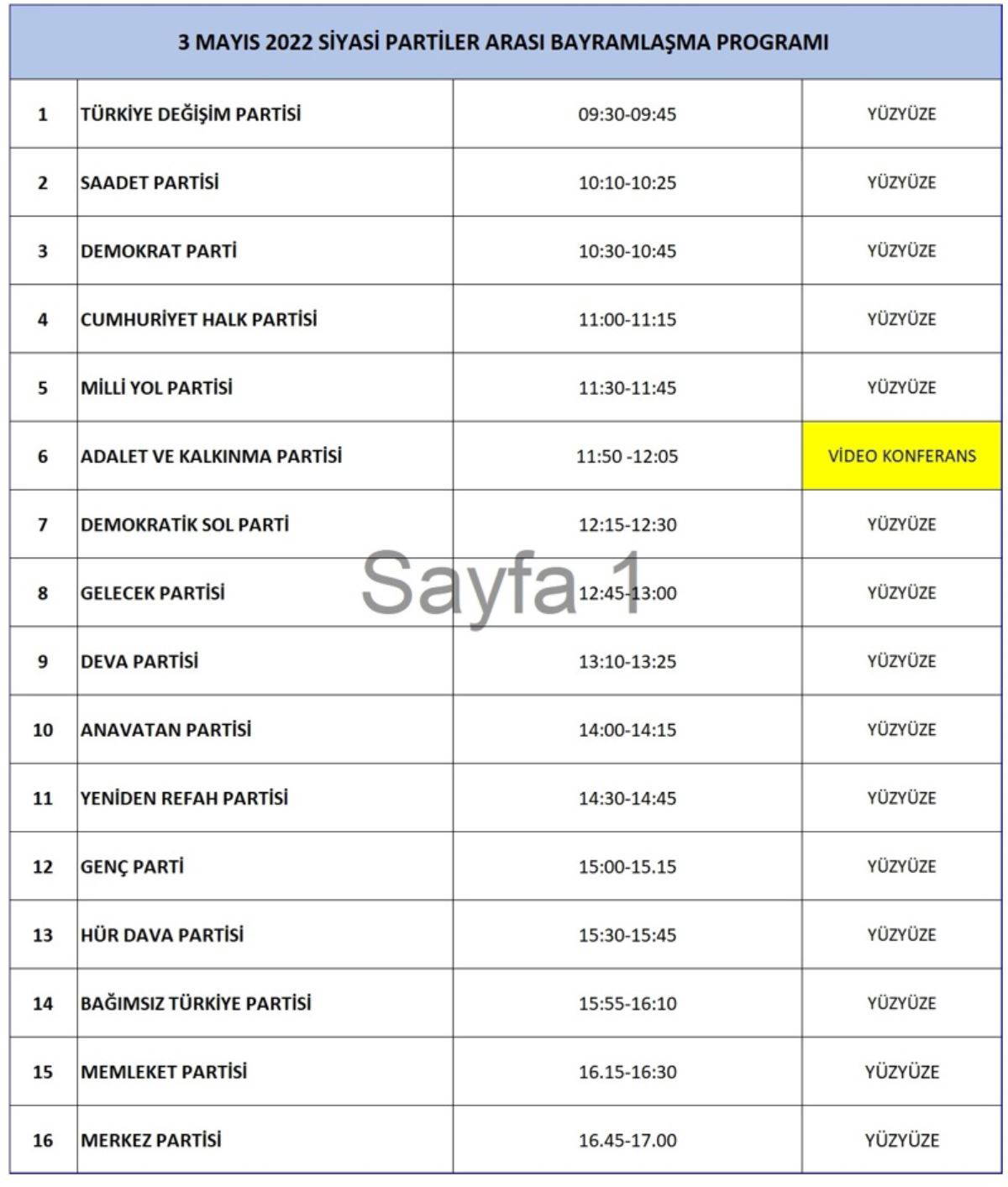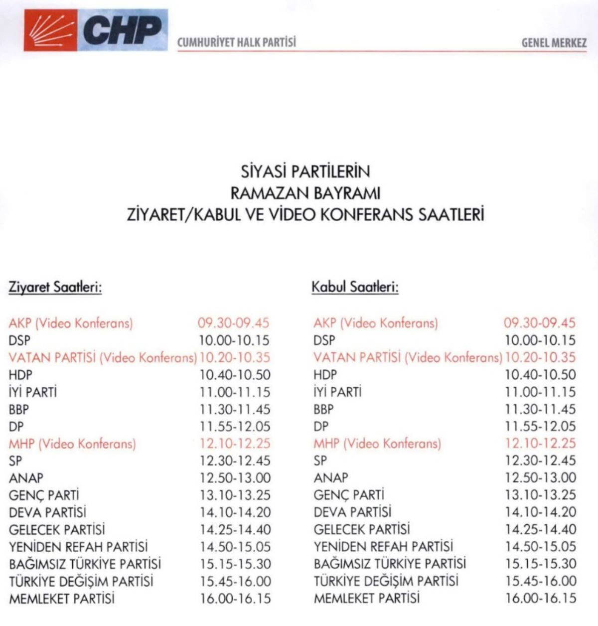 Siyasi partiler arasında bayram ziyaretler bayramın ikinci gününde (yarın) yapılacak. Medyascope'ta yer alan habere göre, Ana muhalefet partisi CHP, bütün siyasi partilerle görüşecek. CHP; AKP, MHP ve Vatan Partisi ile video konferans yöntemiyle bayramlaşacak. CHP diğer partilerle ise yüz yüze görüşecek. Parti Meclisi (PM) Üyesi ve Kadın Kolları Genel Başkanı Aylin Nazlıaka başkanlığındaki Cumhuriyet Halk Partisi kabul heyeti; PM Üyesi ve İstanbul Milletvekili Zeynel Emre, PM Üyesi Semra Dinçer ve Gençlik Kolları Merkez Yönetim Kurulu Üyesi Canan Taşer’den; Genel Başkan Yardımcısı ve İstanbul Milletvekili Fethi Açıkel başkanlığındaki ziyaret heyeti ise Kadın Kolları Merkez Yönetim Kurulu Üyesi Armağan Akyüz ile Gençlik Kolları Merkez Yönetim Kurulu Üyesi Yusuf Baştuğ’dan oluşuyor.