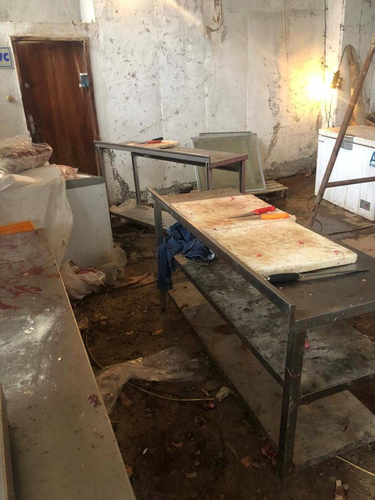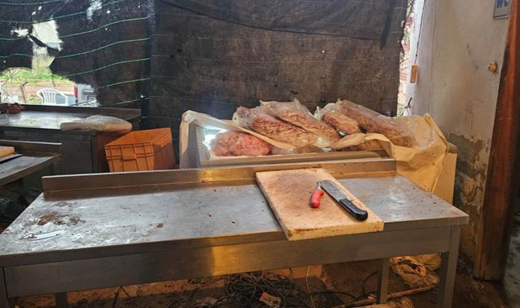 Binanın girişindeki alanın mezbahaya dönüştürüldüğü tespit edildi. Alandaki 9 dolap içerisinde çok sayıda karkas halde koyun eti bulunurken, bidonlar ve kovalar içerisinde de ne eti olduğu tespit edilemeyen çürümüş kıyma ve parça etler ele geçirildi.