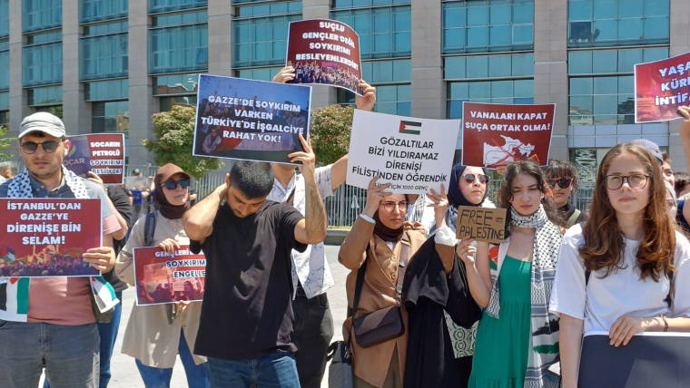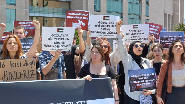 Filistin için Bin Genç topluluğu, gözaltına alınan arkadaşlarına destek olmak için adliye önündeki Çağlayan Meydanı'nda toplandı.