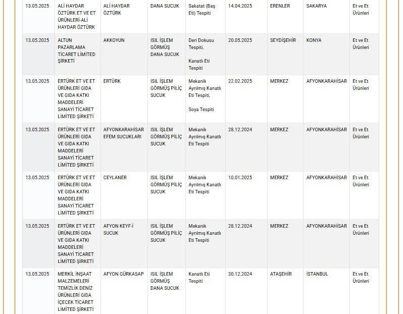 Ertürk Sucuk (Ertürk Et ve Et Ürünleri Ltd. Şti.): Sucukların içinde mekanik ayrılmamış kanatlı eti ve soya bulunduğu bildirildi.