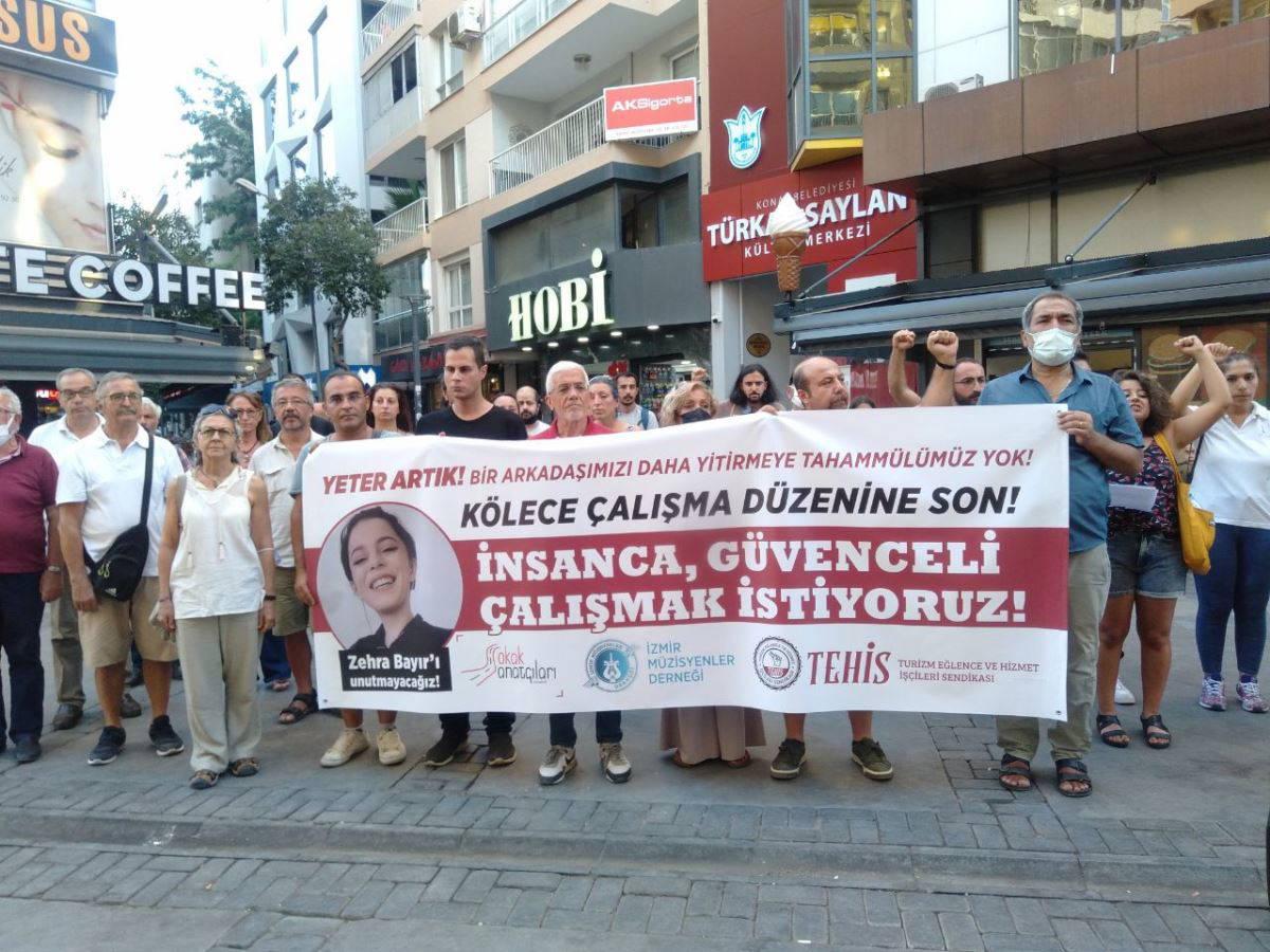 Müzik saatlerinin değil müziğin ve sanatın kendisinin yasaklanmaya çalışıldığını aktaran TEHİS İzmir temsilcisi müzik emekçisi Okan Kılınç, Türkiye’nin sanatın yok sayıldığı şeriatçı bir düzene evrildiğini ifade etti. Sanata ve sanatçıya bakış açısı değişmediği müddetçe yaşanan krizin aşılamayacağını vurgulayan Kılınç, “Günde yüz lira için çalışan arkadaşlarımız var. Sektörü ve yılların emeğini bırakan müzisyen arkadaşlarımız bugün ya işsiz ya da artık fabrikalarda çalışıyor veya moto kuryelik yapıyor” diyerek yaşadıkları sıkıntıları özetledi.