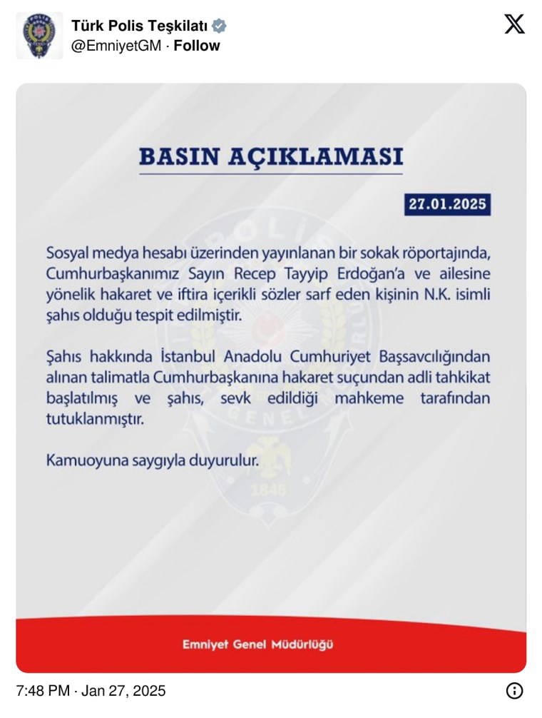 "Sosyal medya hesabı üzerinden yayınlanan bir sokak röportajında, Cumhurbaşkanımız Sayın Recep Tayyip Erdoğan'a ve ailesine yönelik hakaret ve iftira içerikli sözler sarf eden kişinin N.K. isimli şahıs olduğu tespit edilmiştir. Şahıs hakkında İstanbul Anadolu Cumhuriyet Başsavcılığı'ndan alınan talimatla Cumhurbaşkanına hakaret suçundan adli tahkikat başlatılmış ve şahıs, sevk edildiği mahkeme tarafından tutuklanmıştır."