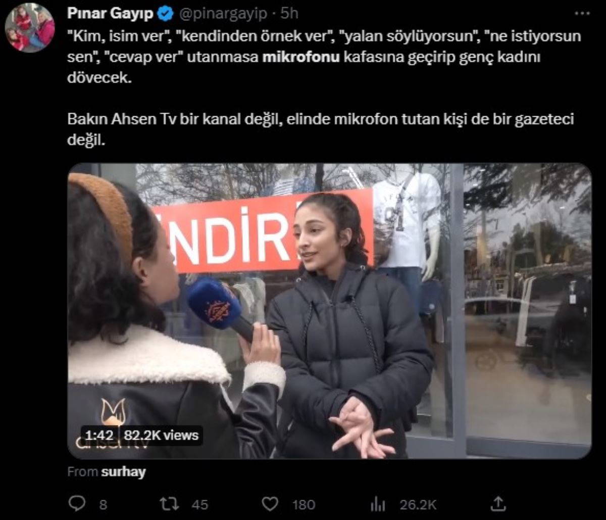 - "'Kim, isim ver', 'Kendinden örnek ver', 'Yalan söylüyorsun', 'Ne istiyorsun sen', 'Cevap ver' utanmasa mikrofonu kafasına geçirip genç kadını dövecek. Bakın Ahsen Tv bir kanal değil, elinde mikrofon tutan kişi de bir gazeteci değil."
