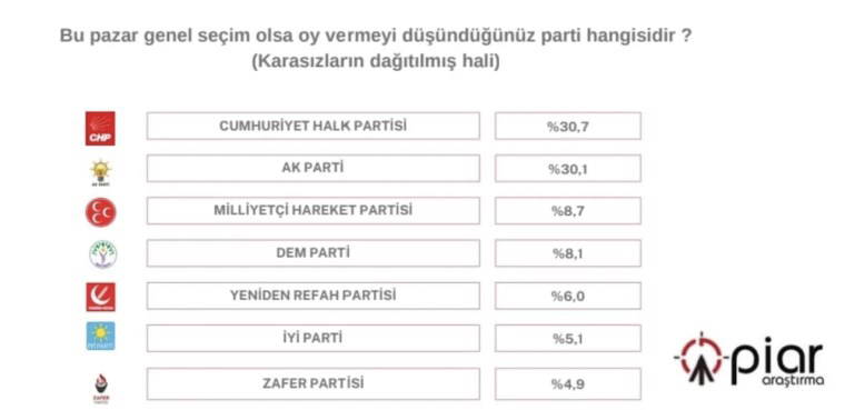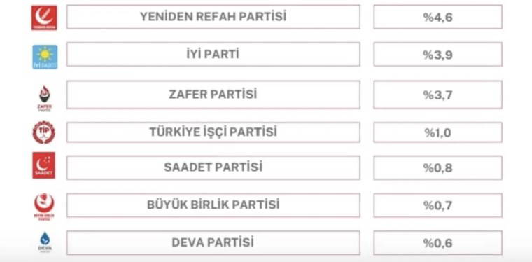 'Kararsızlar' dağıtılmadan diğer partilerin oy oranlarına bakıldığında ise Yeniden Refah Partisi yüzde 4.6 oy oranında görünüyor. İYİ Parti 3.9 ve Zafer Partisi de 3.7 oy alabiliyor.