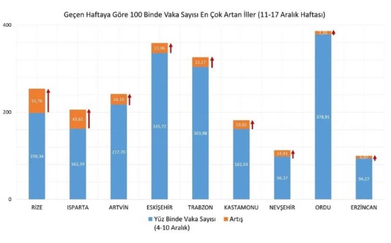 Buna göre, her 100 bin kişide görülen Covid-19 vaka sayısı 11-17 Aralık'ta, İstanbul'da 244,15, Ankara'da 144,10, İzmir'de 67,97 oldu.