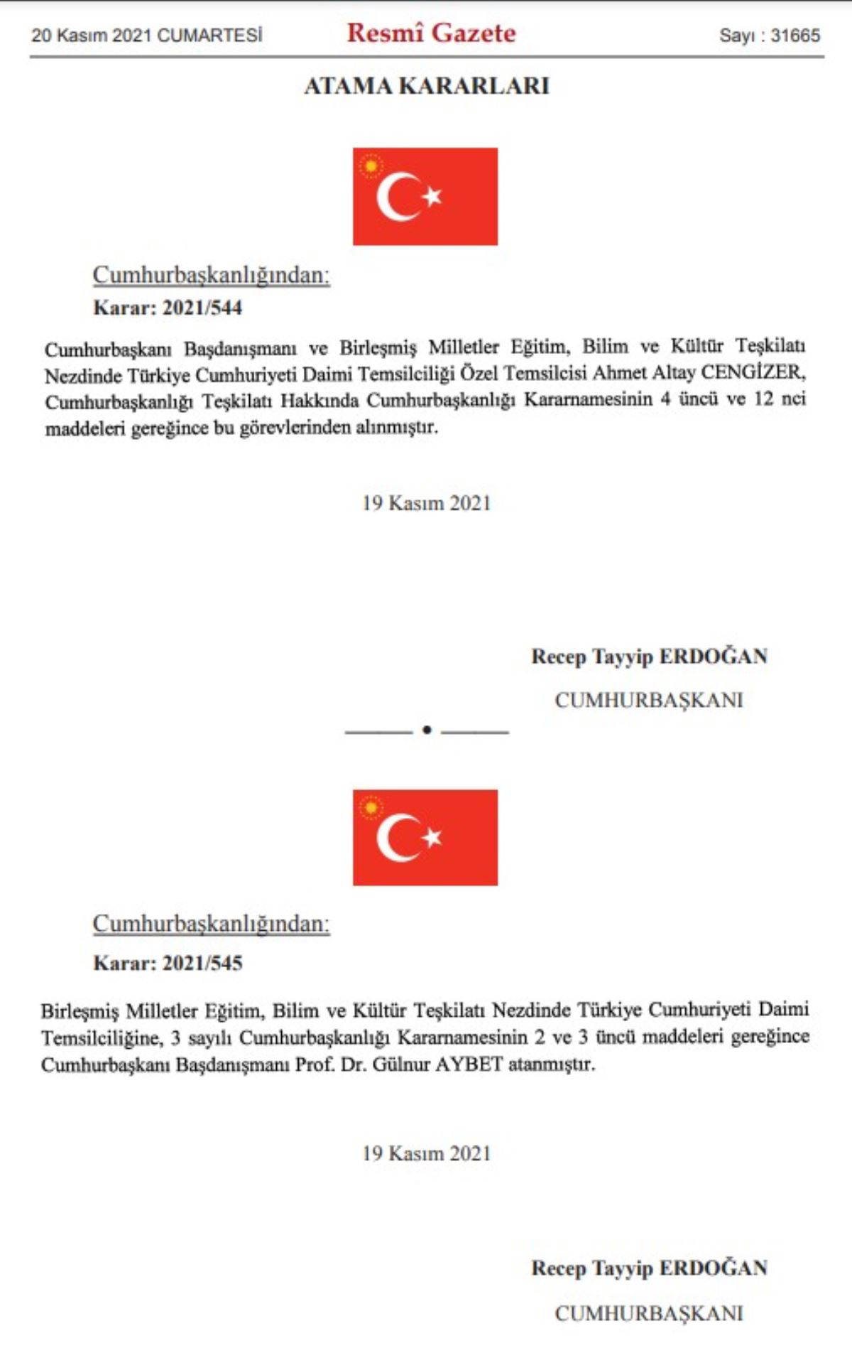 AKP'li Cumhurbaşkanı Recep Tayyip Erdoğan'ın imzasıyla Resmi Gazete'de yayınlanan atama kararıyla Cumhurbaşkanı Başdanışmanı ve Birleşmiş Milletler Eğitim, Bilim ve Kültür Teşkilatı (UNESCO) Türkiye Daimi Temsilciliği Özel Temsilcisi Ahmet Altay Cengizer, bu görevlerinden alındı.