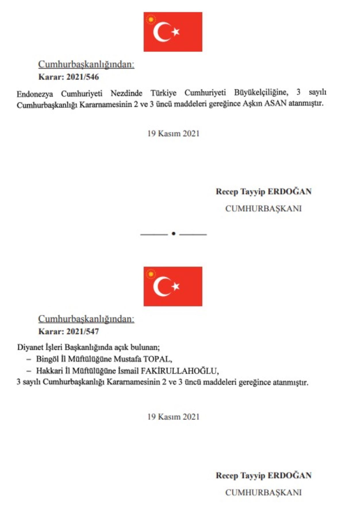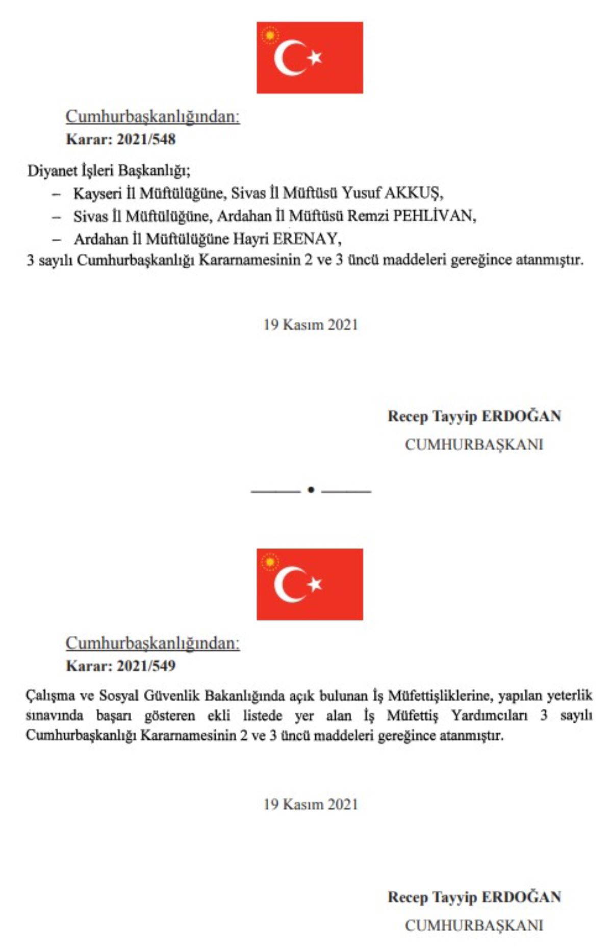 Diyanet İşleri Başkanlığı’nda 5 ile müftü ataması gerçekleşti. Çalışma ve Sosyal Güvenlik Bakanlığı’nda açık bulunan iş müfettişliklerine de 128 atama yapıldı.