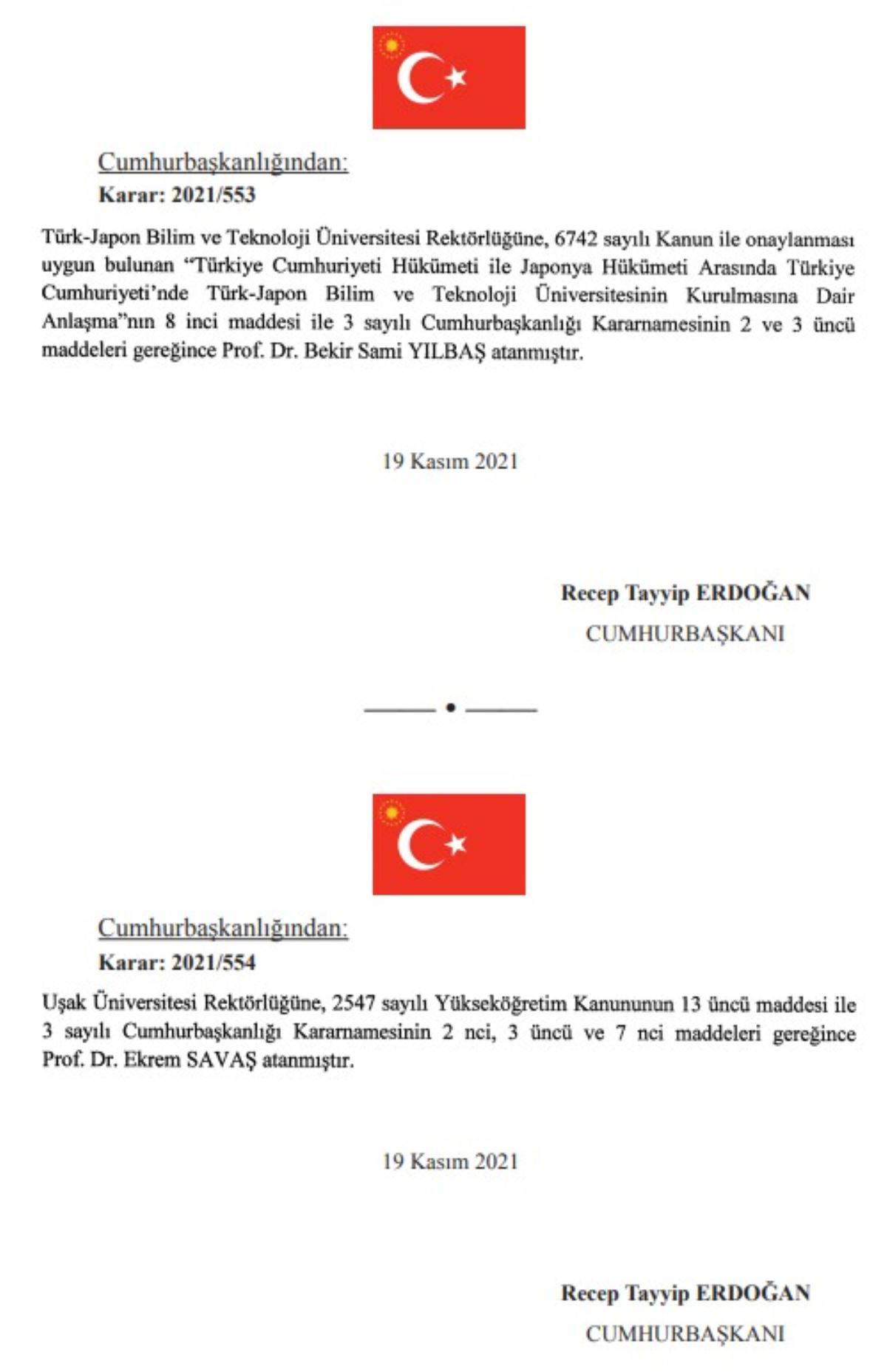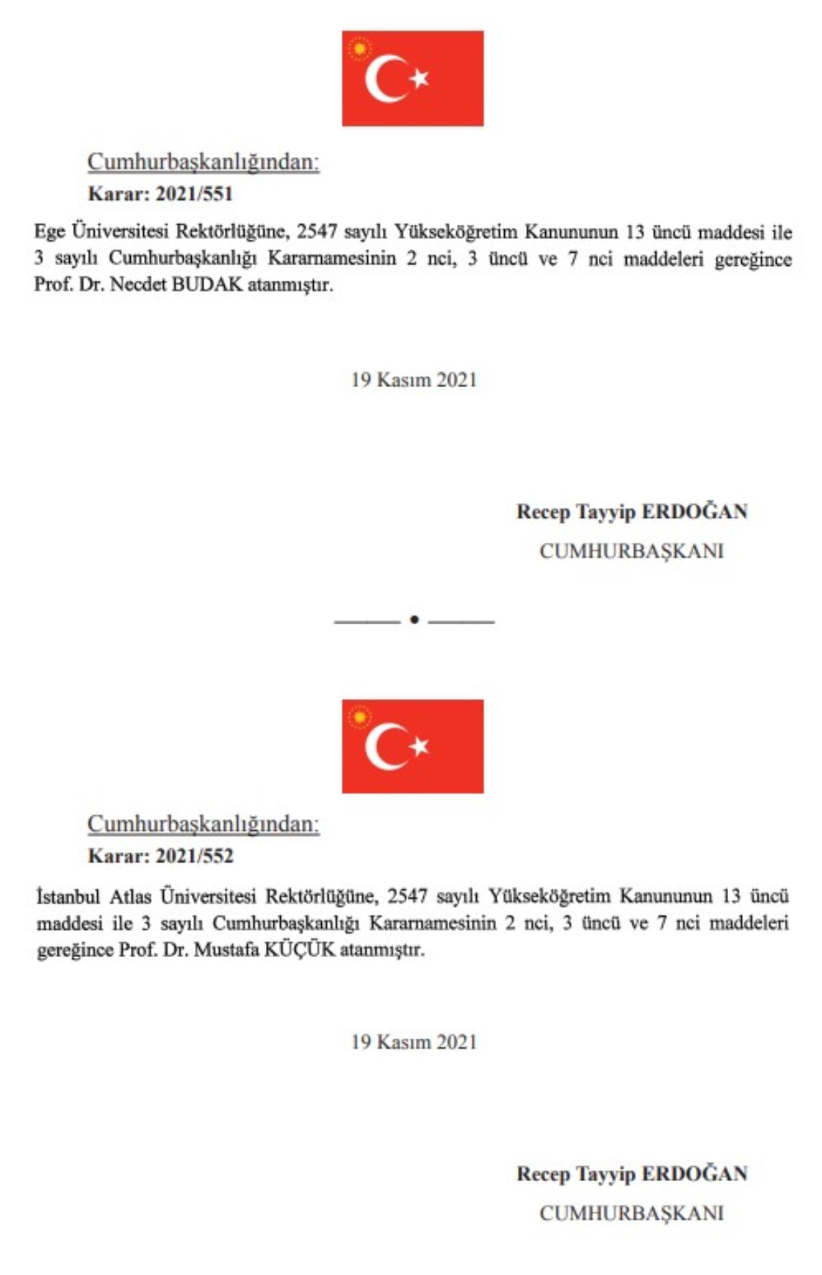 Kararlara göre bazı üniversitelere de rektör atandı. Ege Üniversitesi’ne Prof. Dr. Necdet Budak, İstanbul Atlas Üniversitesi’ne Prof. Dr. Mustafa Küçük, Türk-Japon Bilim ve Teknoloji Üniversitesi Rektörlüğü’ne Prof. Dr. Bekir Sami Yılbaş, Uşak Üniversitesi’ne Prof. Dr Ekrem Savaş atandı.
