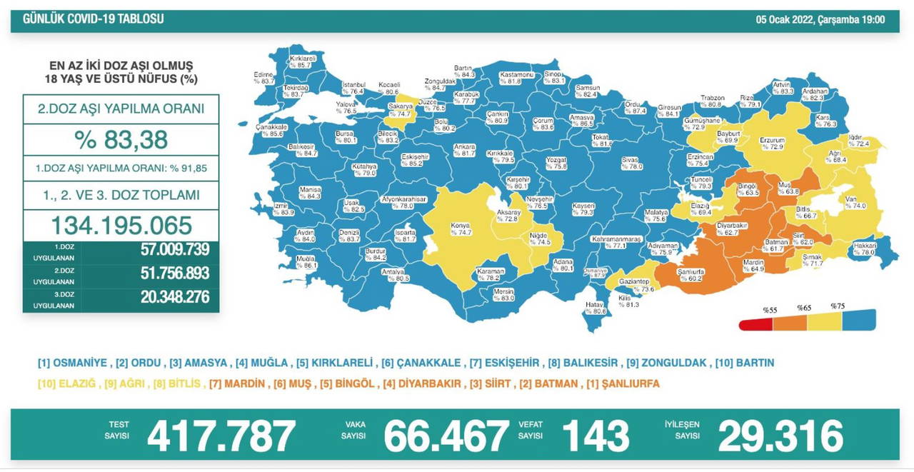 Son 24 saatte, 66 bin 467 yeni vaka tespit edildi. 29 bin 316 kişi de sağlığına kavuşurken korona nedeniyle bugün 143 kişi hayatını kaybetti.
