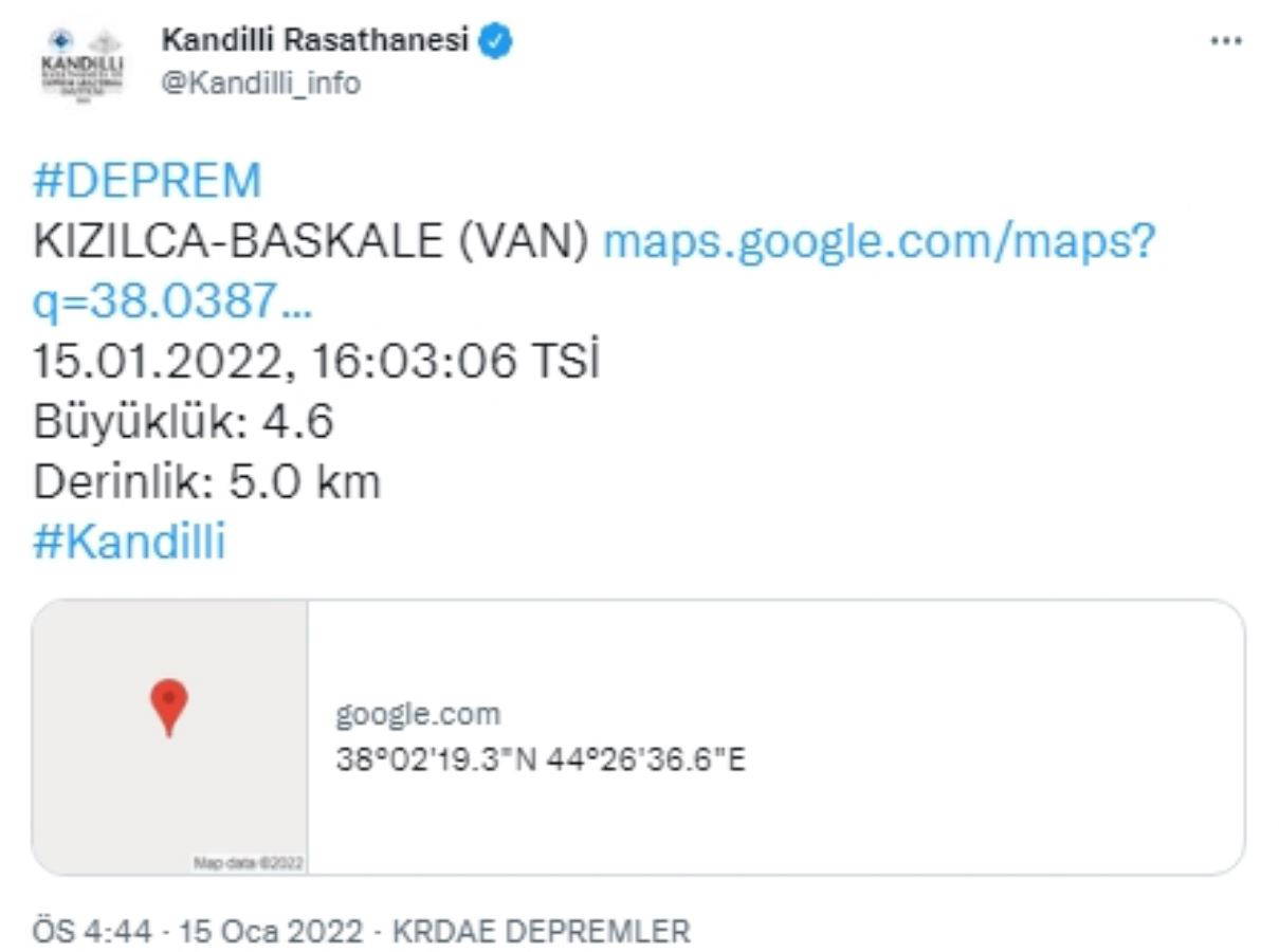 Van'ın Başkale ilçesi yakınlarında, saat 16.03'te bir deprem meydana geldi.