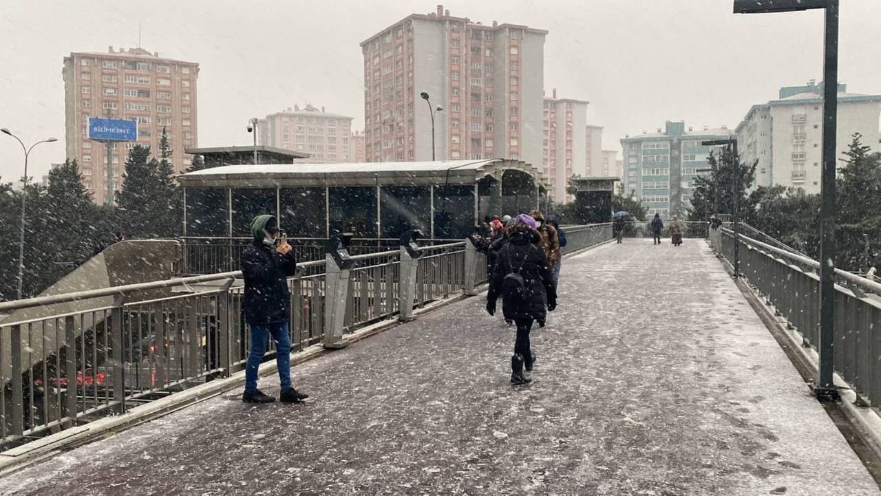 Beylikdüzü’nde lapa lapa yağan kar yağışı yurttaşlara zor anlar yaşattı. İlçedeki bir köprünün üzeri beyaza bürünürken, vatandaşlar yürümekte zorluk çekti.