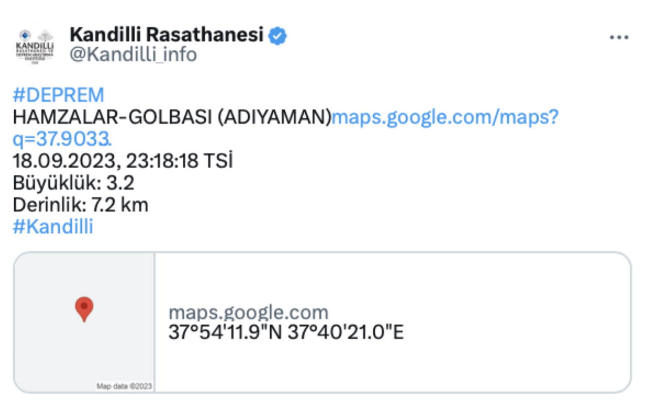 Kandilli Rasathanesi Adıyaman'ın Gölbaşı ilçesinde 3.2 büyüklüğünde bir deprem meydana geldiğini duyurdu.