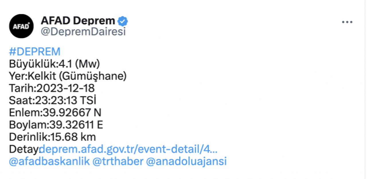 Afet ve Acil Durum Yönetimi Başkanlığı'nın (AFAD) verilerine göre Gümüşhane'nin Kelkit ilçesinde 4.1 büyüklüğünde bir deprem meydana geldi.