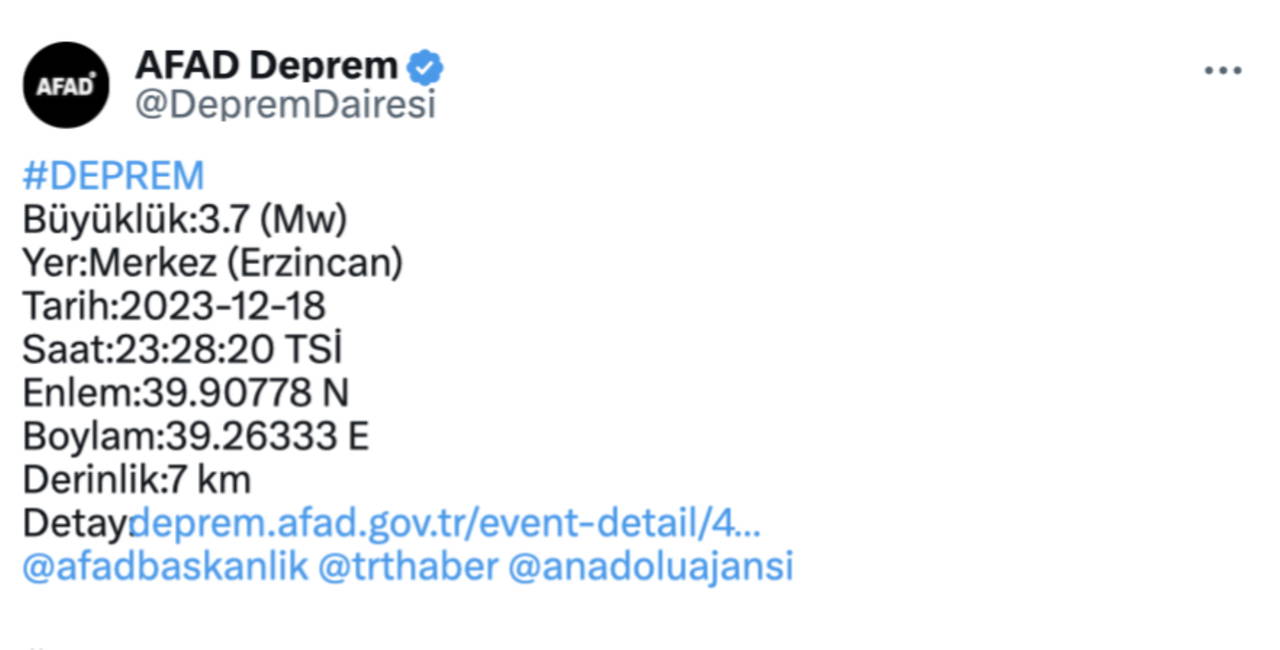 AFAD verilerine göre saat 23.28'de Erzincan Merkez'de 3.7 büyüklüğünde bir deprem meydana geldi. Depremin, 7 km derinlikte gerçekleştiği bildirildi.