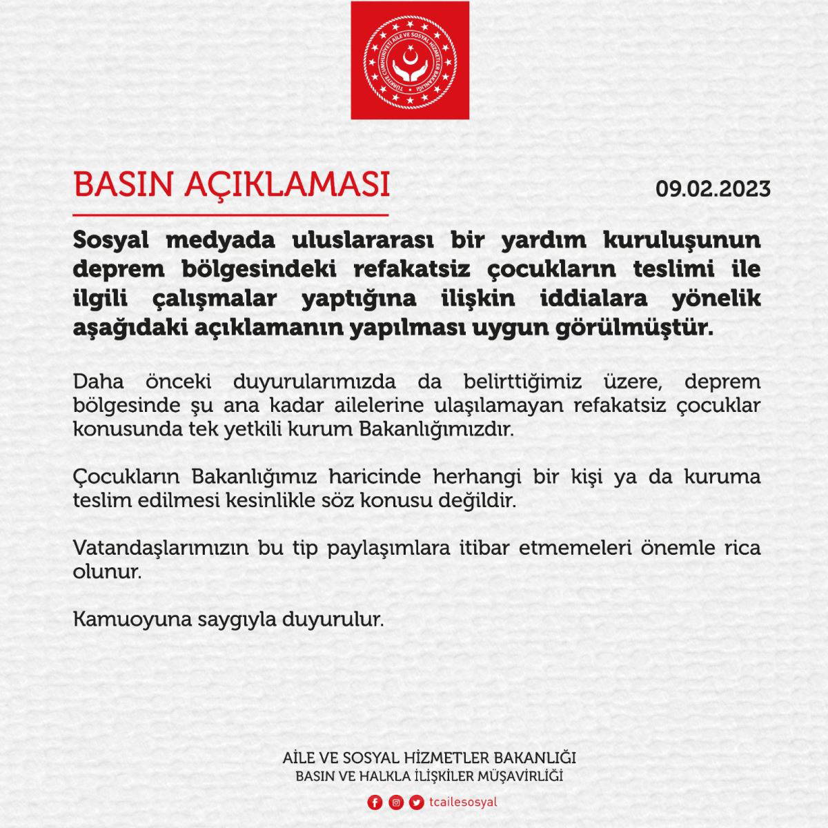 "Daha önceki duyurularımız da da belirttiğimiz üzere, deprem bölgeisnde şu ana kadar ailelerine ulaşılamayan refakatsiz çocuklar konsunda tek yetkili kurum bakanlığımızdır.