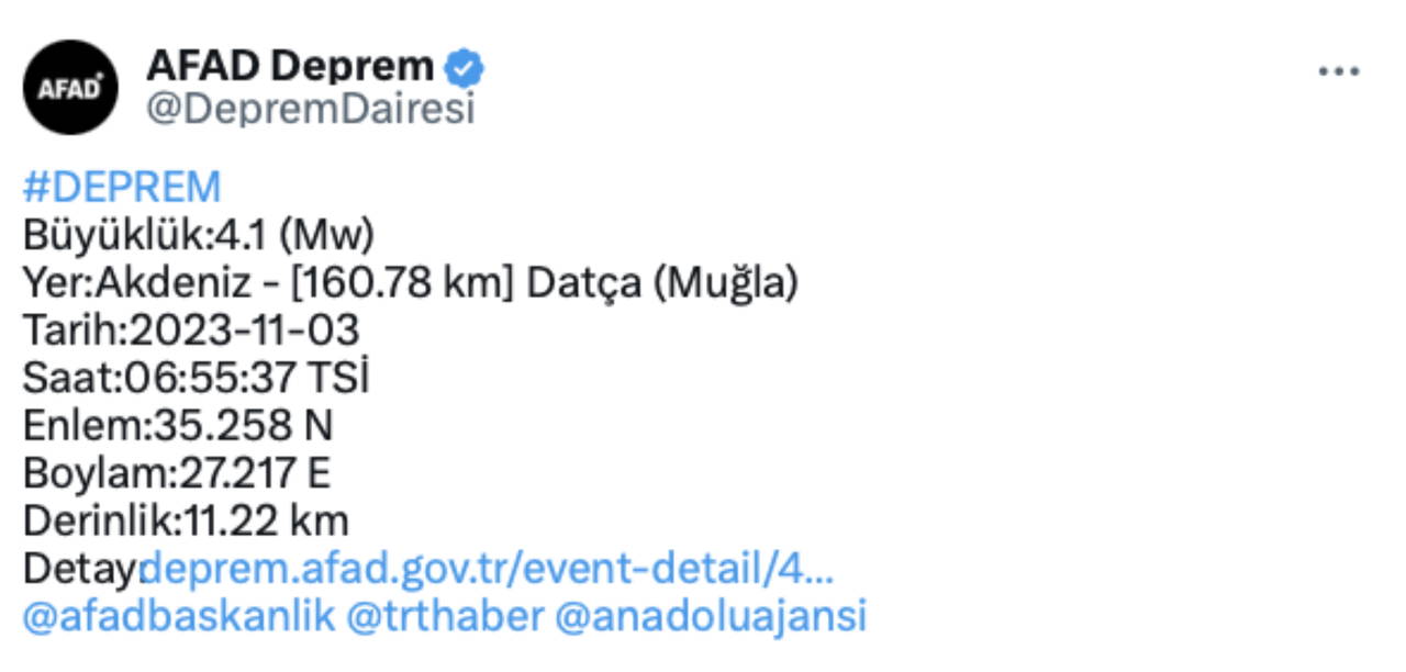 Depremin Muğla'nın Datça ilçesine 160.78 km uzaklıkta olduğu belirtildi.