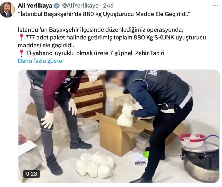 İçişleri Bakanı Ali Yerlikaya’nın paylaştığı bilgilere göre, İstanbul Cumhuriyet Başsavcılığı ile Emniyet Genel Müdürlüğü Narkotik Suçlarla Mücadele Başkanlığı koordinesinde; İstanbul İl Emniyet Müdürlüğü İstihbarat ve Narkotik Suçlarla Mücadele Şube Müdürlüklerince yapılan ortak çalışmalar sonucu; Başakşehir’de 2 araç ve 1 adrese yönelik operasyon düzenlendi.